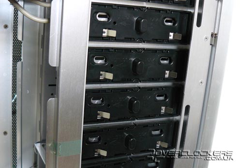 Алюминиевая корзина для HDD рассчитана на четыре накопителя, которые фиксируются винтами, при этом вынуть её из корпуса очень тяжело – порой приходится приложить не дюжую силу, чтобы извлечь корзину из Stacker’а. С установкой на место - аналогичная проблема.