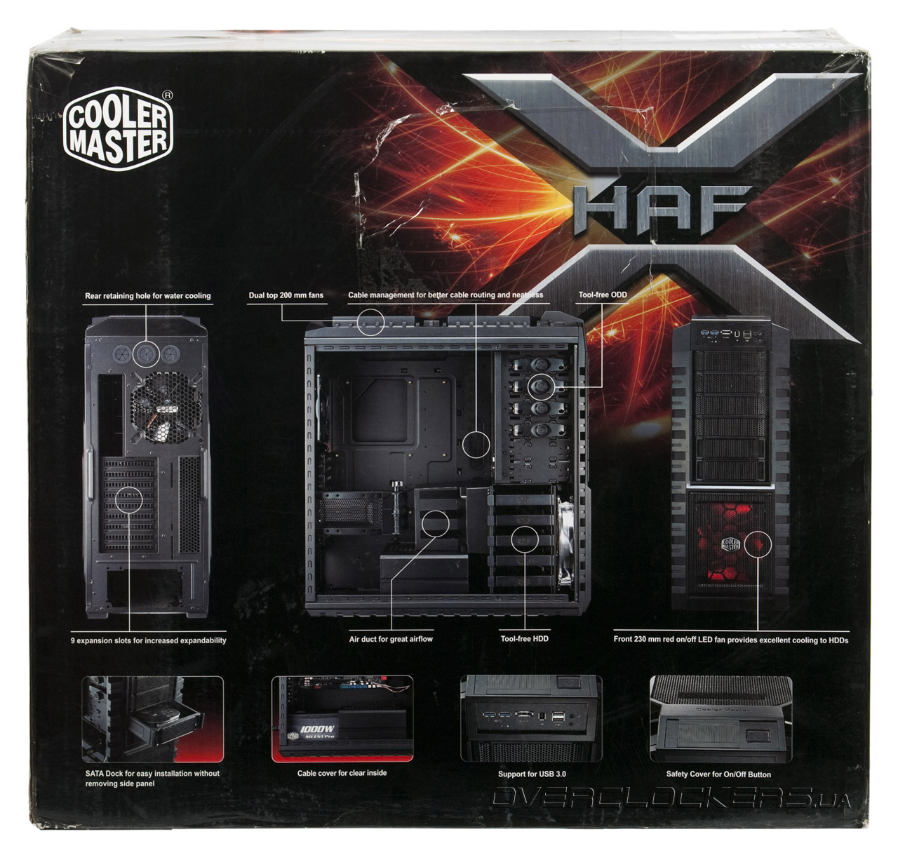 Производитель выделяет следующие особенности, присущие HAF X: наличие четырех предустановленных вентиляторов и трех отверстий для шлангов СВО, продуманную систему укладки кабелей, удобные механизмы для инсталляции накопителей, богатый набор разъемов на панели ввода-вывода (включая USB 3.0), фирменные приспособления VGA Fan Duct и VGA Holder для более эффективного охлаждения и надежной фиксации видеоадаптеров соответственно. Девять заглушек под карты расширения PCI Express/PCI указывают на возможность построения графических связок из четырех дискретных видеокарт, если, конечно, такая возможность допускается со стороны материнской платы.