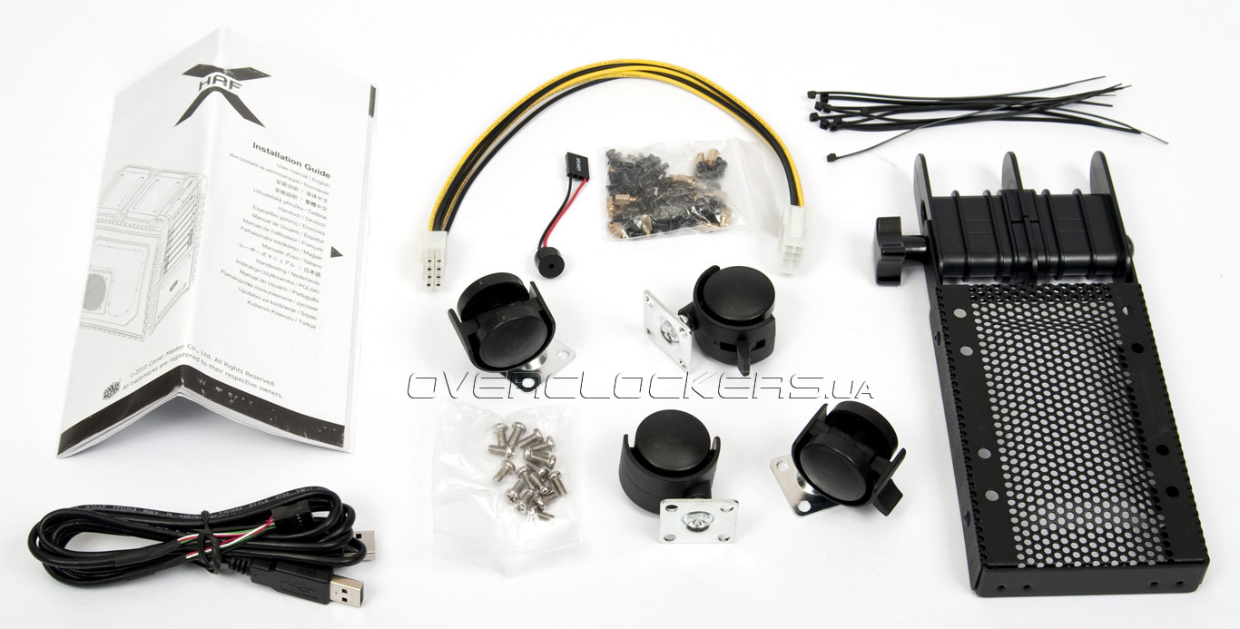 В комплекте поставки обнаруживаются такие нужные вещи, как инструкция по сборке системы, интерфейсный кабель USB 3.0/USB 2.0, удлинитель кабеля питания EPS12V, динамик (speaker), четыре пластиковых колесика для перемещения шасси по столу или полу, наборы крепежа и стяжек и вышеупомянутый держатель VGA Holder. Наличие последнего объясняется растущим весом топовых видеокарт.