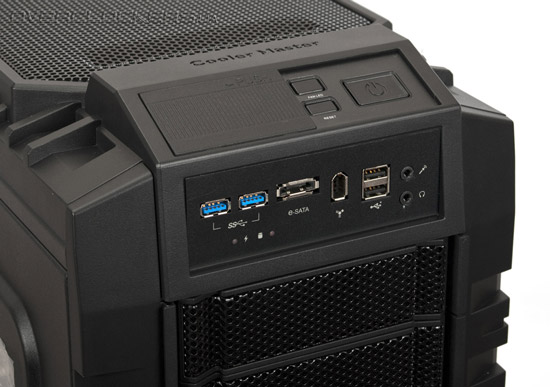 Панель I/O расположена в верхней части. На нее выведены порты USB 3.0 (два), USB 2.0 (два), единичные eSATA и IEEE1394a, разъемы для подключения наушников и микрофона. Чуть выше, в торце, размещена кнопка включения/выключения LED-подсветки и привычные Power и Reset, накрываемые пластиковой шторкой.