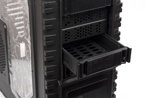 Прежде чем перейти к изучению внутреннего устройства Cooler Master HAF X, отметим, что два нижних 5,25-дюймовых отсека могут быть использованы для установки SATA-накопителей типоразмера 3,5"/2,5" с опцией «горячей» замены.