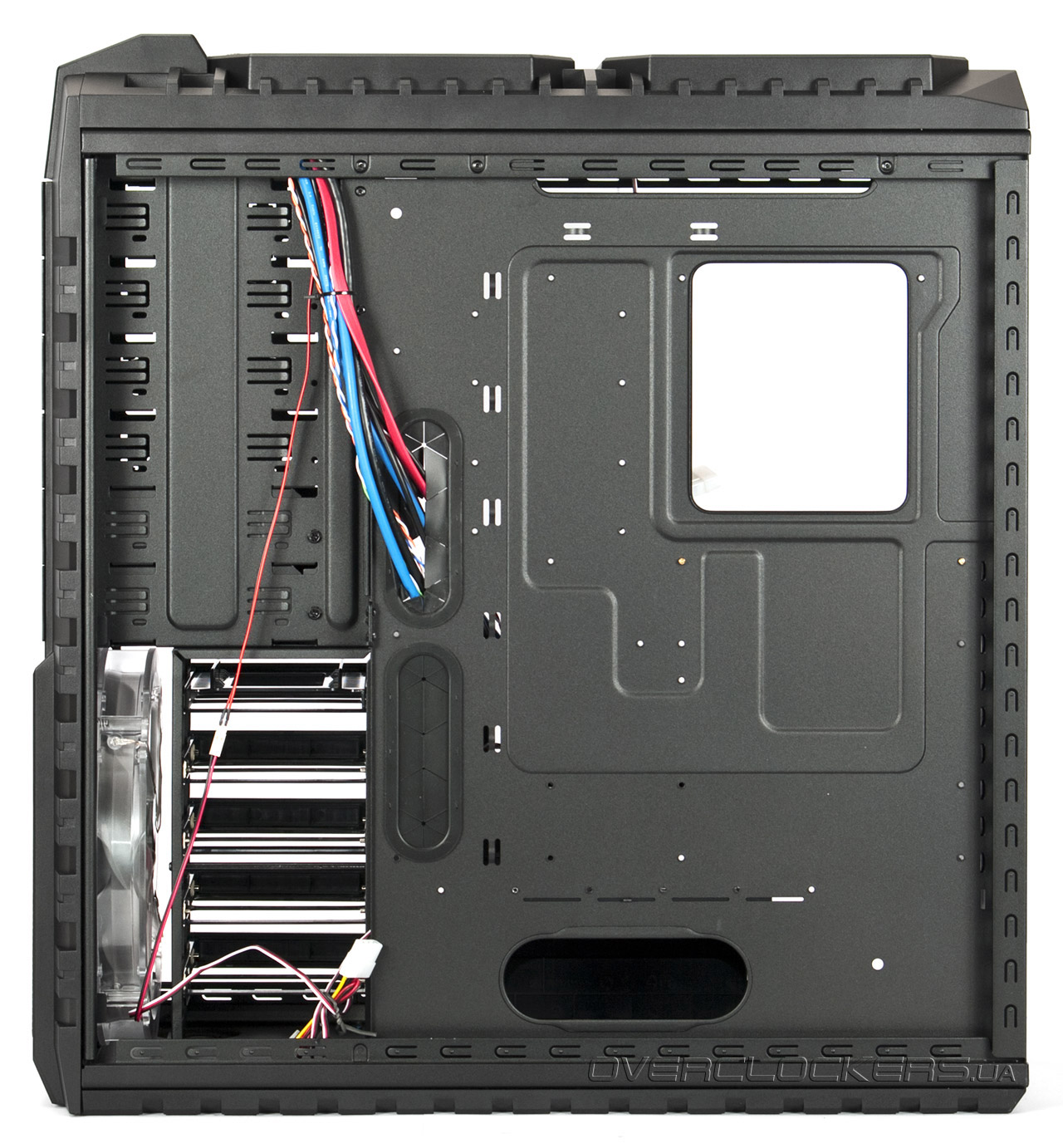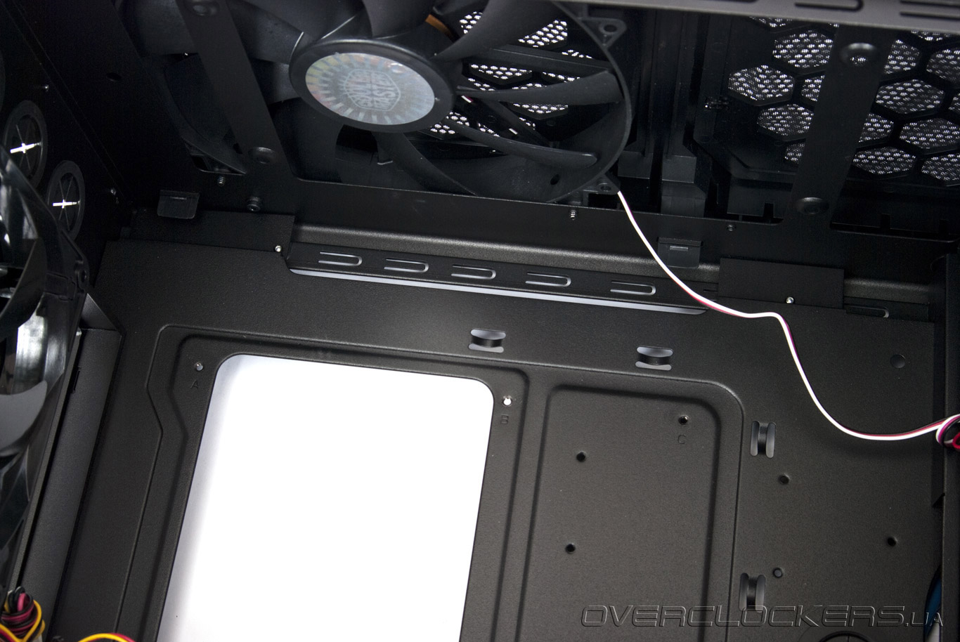 Поддон материнской платы имеет несколько специальных отверстий. В районе процессорного сокета выполнено квадратное окно, предполагающее монтаж кулеров без извлечения системной платы из корпуса. Также присутствуют четыре овальных отверстия для укладки кабелей. Два из них снабжены резиновыми шторками.