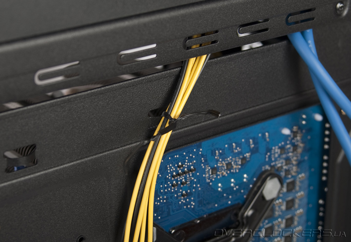 Сверху и справа от материнской платы, с обратной стороны поддона, имеются «ушки» для стяжек, фиксирующих различные кабели.