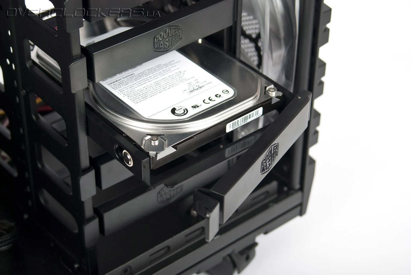 HAF X рассчитан на установку 12-ти накопителей: четырех «внешних» формата 5,25", двух 2,5"/3,5" с опцией «горячей» замены, пяти 3,5" и одного 2,5", который крепится к держателю VGA Holder. Корзина для жестких дисков развернута на 90°.