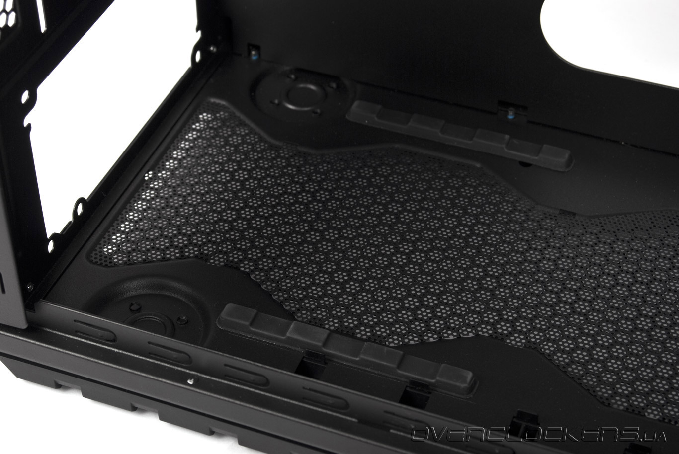 Блок питания укладывается на две резиновые полоски, снижающие уровень паразитных вибраций. Как уже было сказано, отверстие в днище корпуса оснащено пылезащитным фильтром.