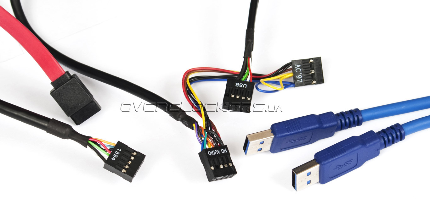 Также необходимо подсоединить к материнской плате кабели, идущие от панели I/O: звук (HD Audio/AC’97), USB 2.0, USB 3.0, FireWire и шлейф SATA.