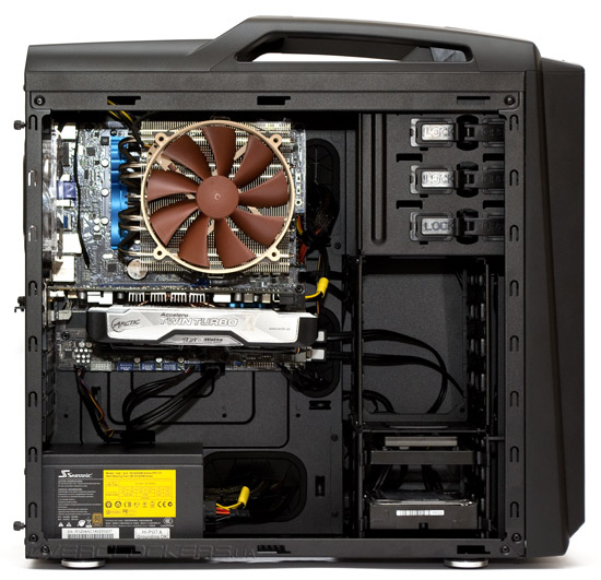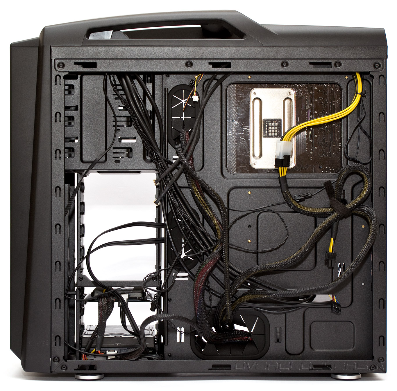 Сборка системы в этом корпусе приносит удовольствие. Ни одной проблемы в процессе выявлено не было. Подгонка деталей и общее качество изготовления шасси находится на очень высоком уровне. Имеется легкий доступ к любой части системы. Поэтому для тех, кто часто меняет комплектующие, это шасси станет находкой. Больше всего впечатляет нетребовательность к укладке кабелей. Большой запас места за поддоном позволил без заминки закрыть правую дверцу, даже имея вот такой клубок проводки: