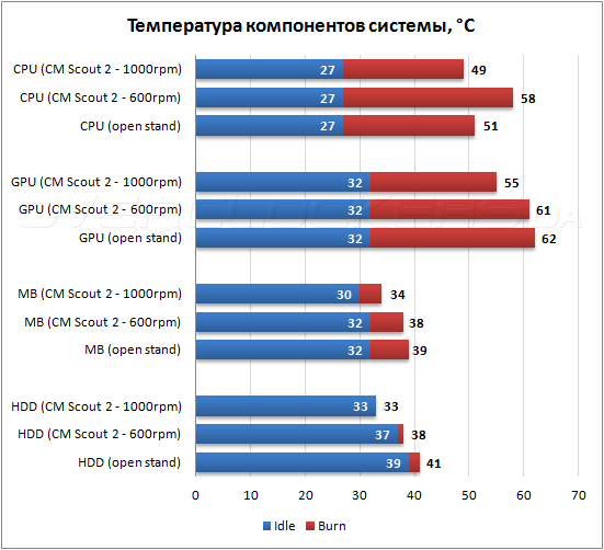 Тест системы охлаждения подтвердил наши опасения касательно чрезмерного количества препятствий для движения воздуха. При 1000 об/мин корпусных вентиляторов Storm Scout 2 легко обходит открытый стенд по всем параметрам. Но, при снижении скорости вертушек до бесшумных 600 об/мин, система охлаждения корпуса приближается вплотную к открытому стенду по эффективности. А в случае с температурой процессора разрыв становится просто титаническим в пользу открытого стенда. Последнее объясняется отчасти спецификой Noctua NH-C14, которой не хватает воздуха в силу близости к боковой панели. Но основными причинами повышения температур можно считать слишком мелкие отверстия в верхней и фронтальной панелях, а также конструкцию корзины жестких дисков. Вентиляторам на низких оборотах не хватает давления, чтобы их продуть. Тем не менее, в целом имеем весьма положительный результат.