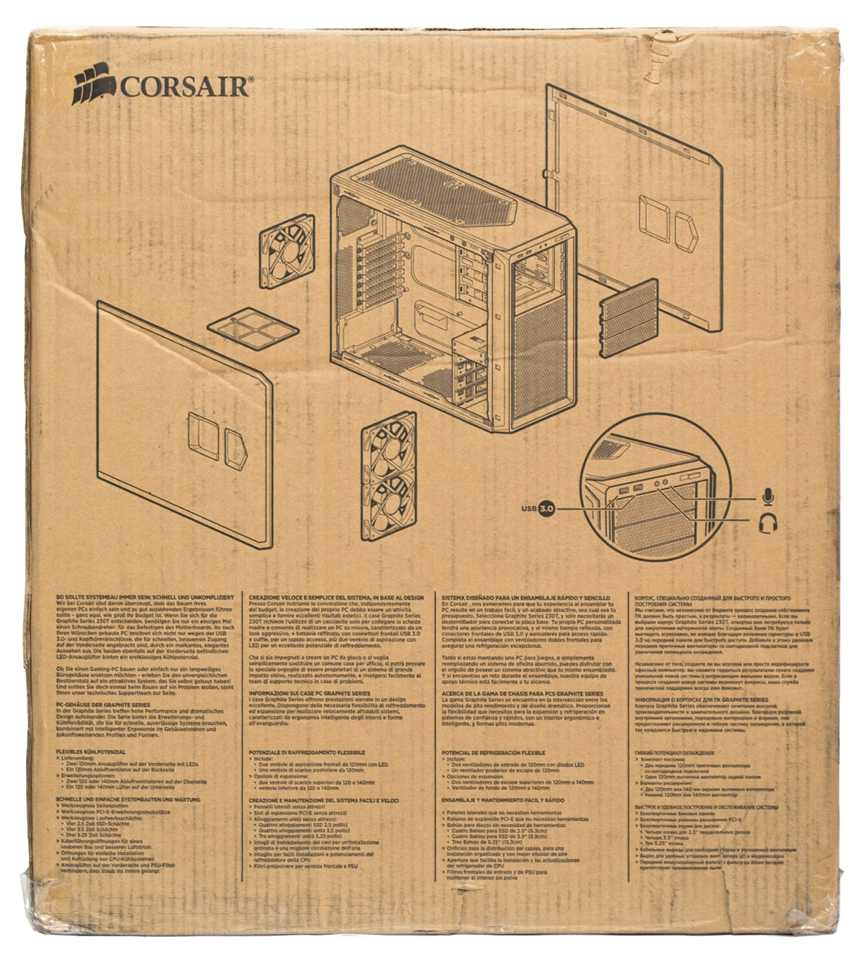 Corsair Graphite 230T поставляется в обычной коробке с монохромной, но достаточно информативной полиграфией на бортах. Защита от повреждений типичная: два демпфера из пенопласта, пленка на стекле и полиэтиленовый пакет. Вес брутто — 7,5 кг.