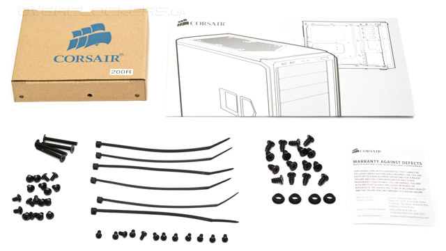 Все необходимые детали содержатся в коробочке с логотипом компании. Наклейка на упаковке красноречиво намекает на конструктивного близнеца рассматриваемой модели из серии Carbide — Corsair 200R. В комплект креплений входят: