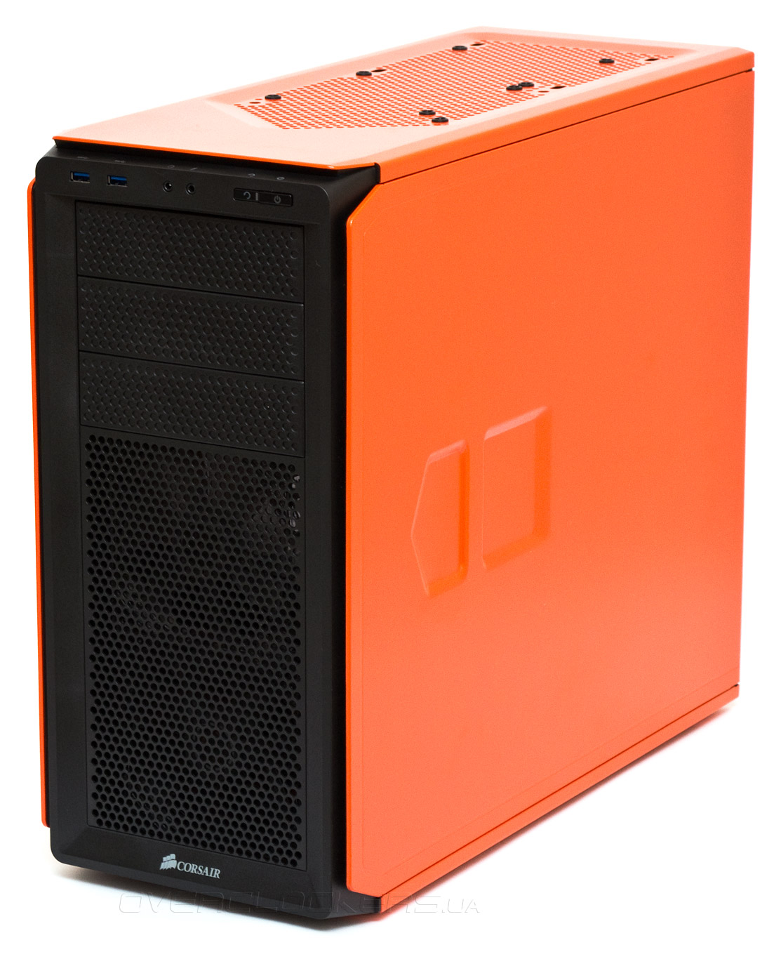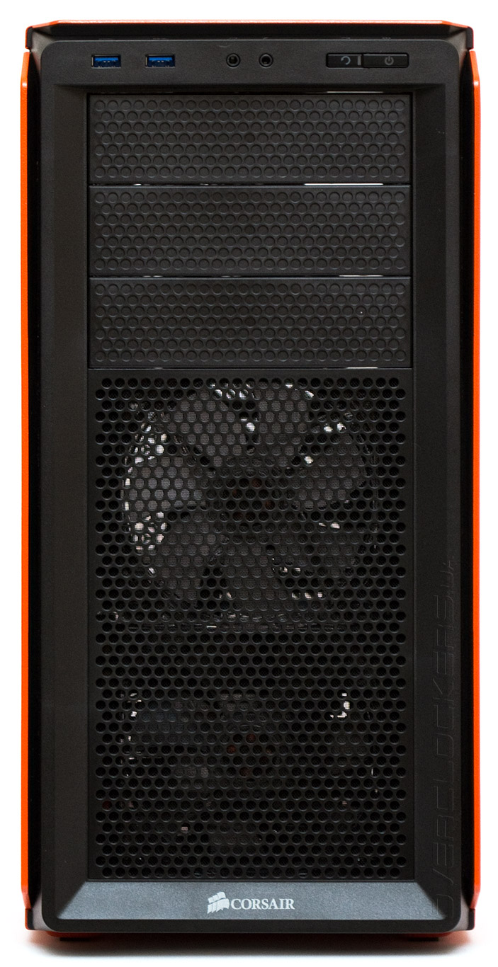 Фронтальная панель сделана таким образом, чтобы вызывать иллюзию металлической поверхности, хотя на самом деле материалом здесь служит пластмасса. Дизайн футуристический. В самом верху находятся внешние порты и кнопки, под ними — три непроницаемые для воздуха заглушки отсеков 5,25″. Нижняя половина передней панели представляет собой перфорированную решетку с круглыми отверстиями, затянутыми сеткой мелкого пылевого фильтра, за которой просматривается силуэт двух вентиляторов. Логотип Corsair красуется на нижней грани.