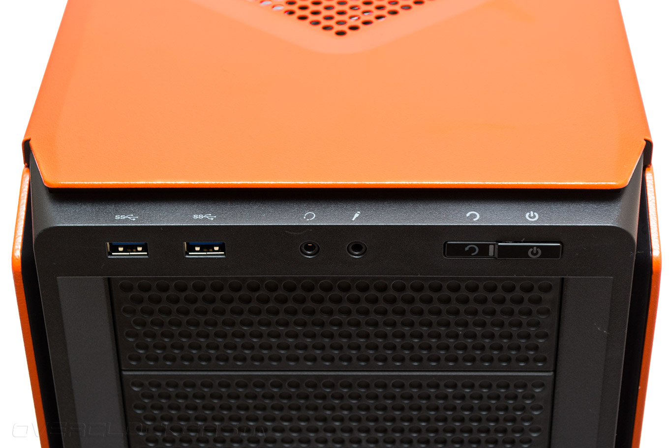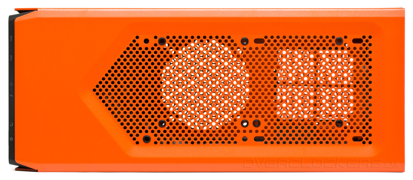 На верхнем торце передней панели горизонтально расположены два порта USB 3.0, два 3,5-мм аудиопорта для наушников с микрофоном и две плоские клавиши перезагрузки и запуска ПК, снабженные индикаторами оранжевого цвета.