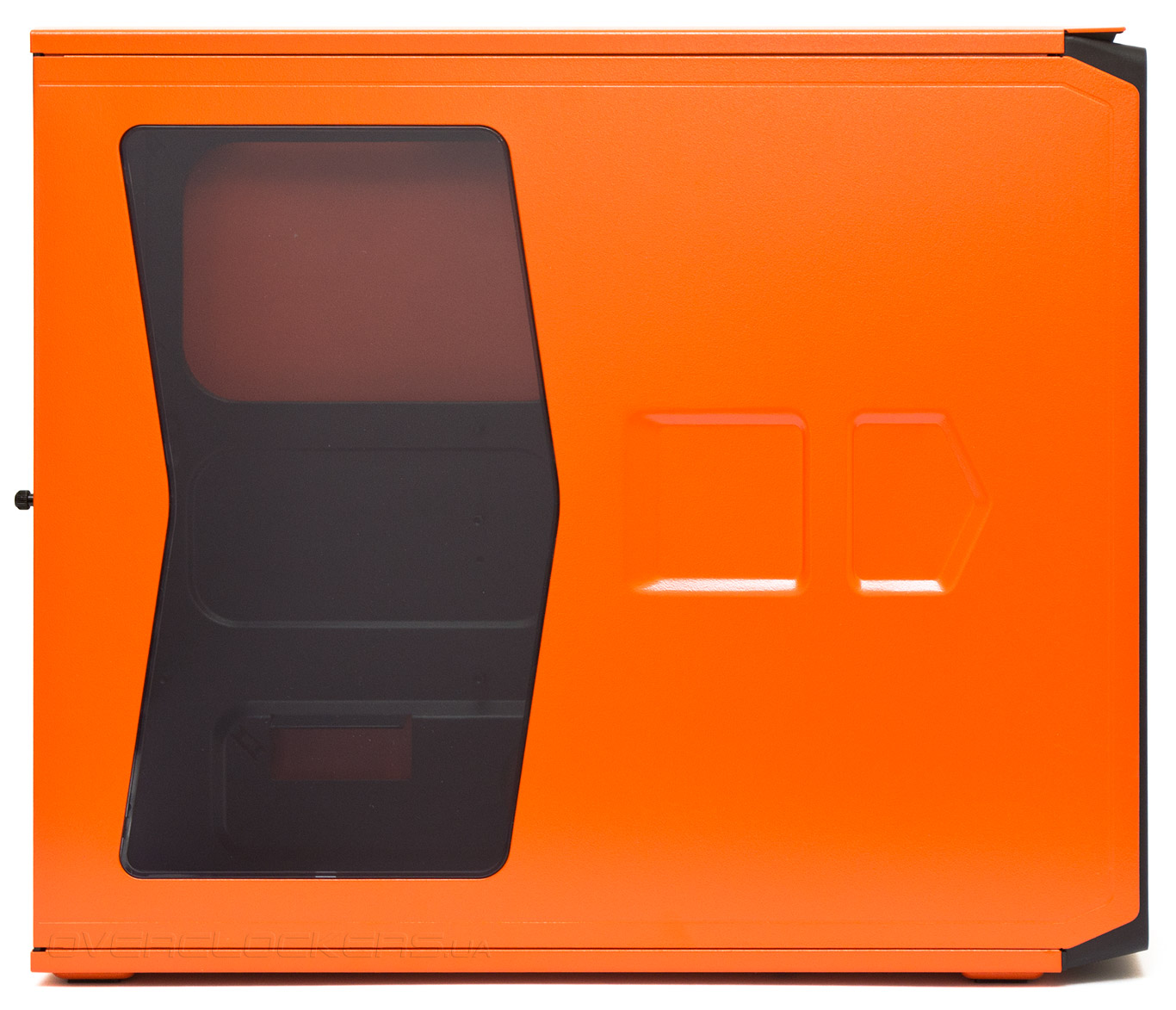 Левая боковая дверца имеет стреловидное акриловое окно. Она удерживается всего одним винтом с накатанной головкой, а «ручки», облегчающие снятие, находятся в передней части. Почему там? Все очень просто — боковые панели для демонтажа сдвигаются не назад, а вперед, после чего извлекаются из пазов по направлению в бок. Такой вариант открывания встречается мне впервые. Схема довольно интересная, ведь дверца дополнительно придерживает переднюю панель и делает всю конструкцию корпуса более жесткой.