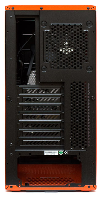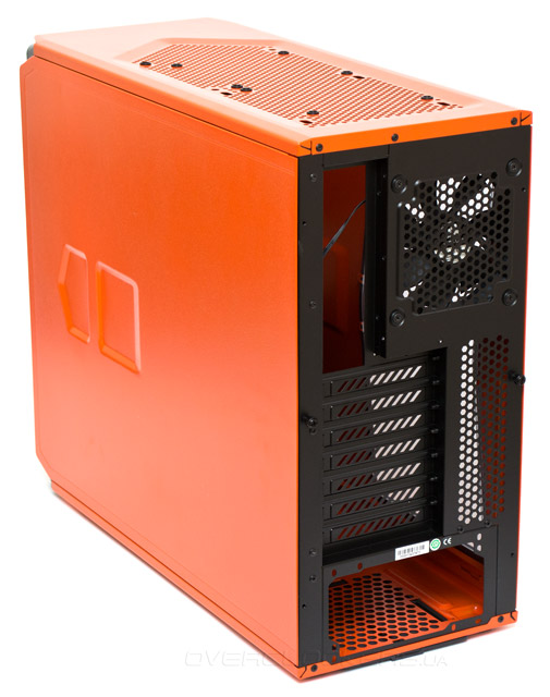Расположение элементов задней панели стандартное для корпусов формата АТХ. В верхнем правом углу, за решеткой, предустановлен на выдув 120-мм вентилятор, ниже находятся семь слотов расширения PCI и дополнительные вентиляционные отверстия.