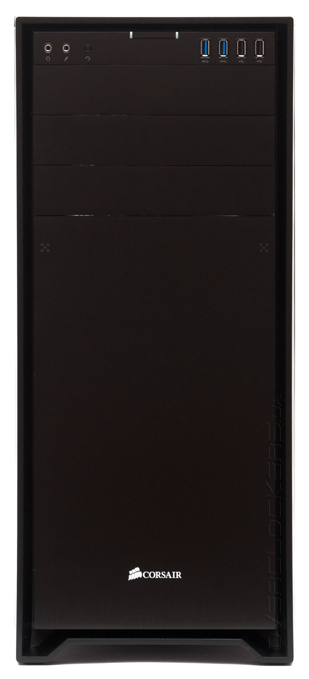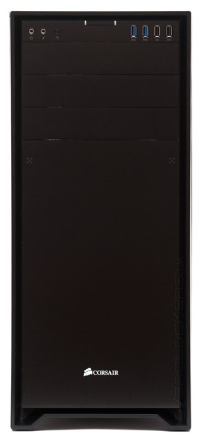 Дизайн Obsidian 750D выполнен в общем для всей линейки строгом стиле. Корпус представляет собой полностью черную металлическую коробку с прямыми углами и без каких-либо декоративных излишеств. Фронтальная панель имеет покрытие, сделанное из тонкого алюминиевого сплава, придающего ей благородный внешний вид. В самом верху расположены внешние порты и кнопки, под ними находятся заглушки трех 5,25″ отсеков, визуально сливающиеся с остальной панелью. Нижняя половина передка корпуса закрыта легкосъемной панелью, на которой хорошо различим белый логотип Corsair, и чьей основной задачей является уменьшение уровня шума, исходящего от передних пропеллеров. Вентиляционные отверстия расположены по ободу этой панели.