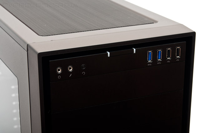 Внешние порты состоят из двух 3,5-мм разъемов для наушников и микрофона, очень мелкой кнопки перезагрузки, тонкой клавиши включения, расположенной ровно по центру и ограниченной с двух сторон белыми индикаторами активности накопителей и работы ПК, двух вертикальных портов USB 3.0 и двух USB 2.0.