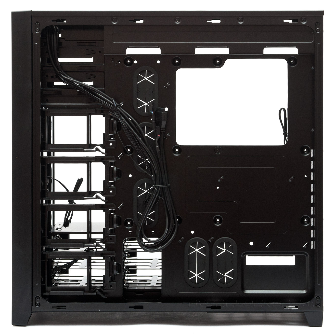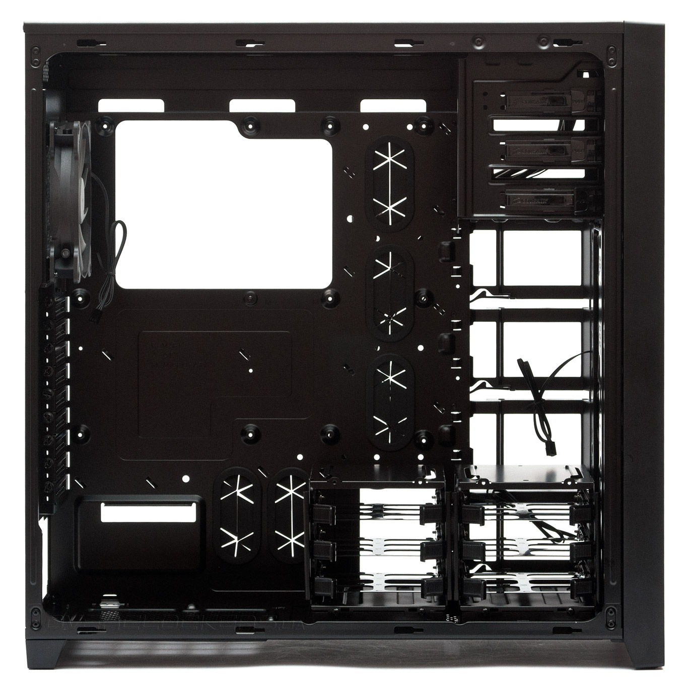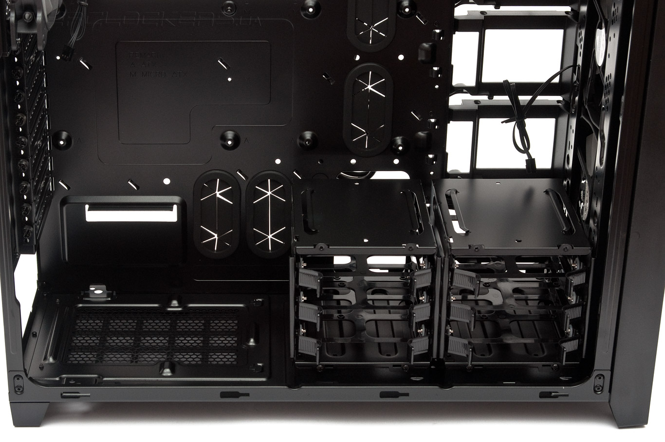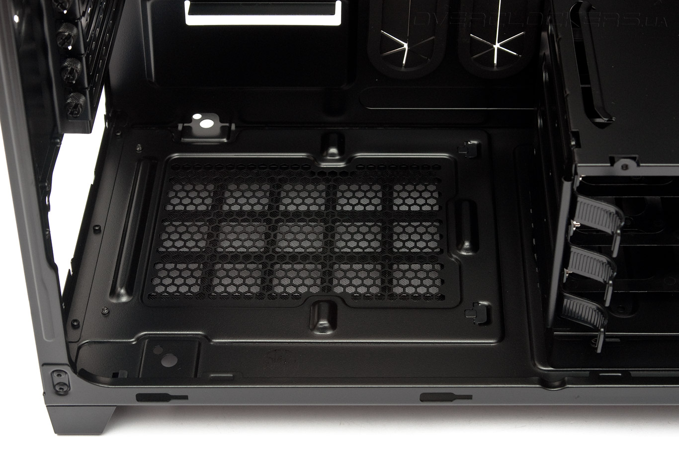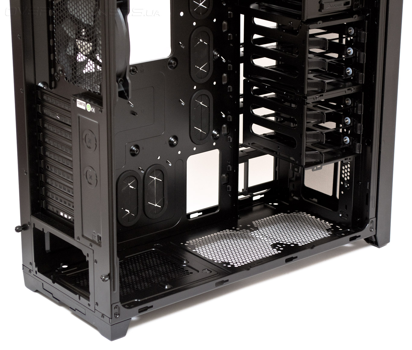 Поддон корпуса имеет большой вырез для установки усилительной пластины кулера и множество крупных отверстий для скрытой укладки проводов, часть из которых закрыта резиновыми шторками. А вот проушин для кабельных стяжек можно было бы сделать и чуть больше. Между поддоном и правой дверцей есть приличный запас пространства в 28 мм.