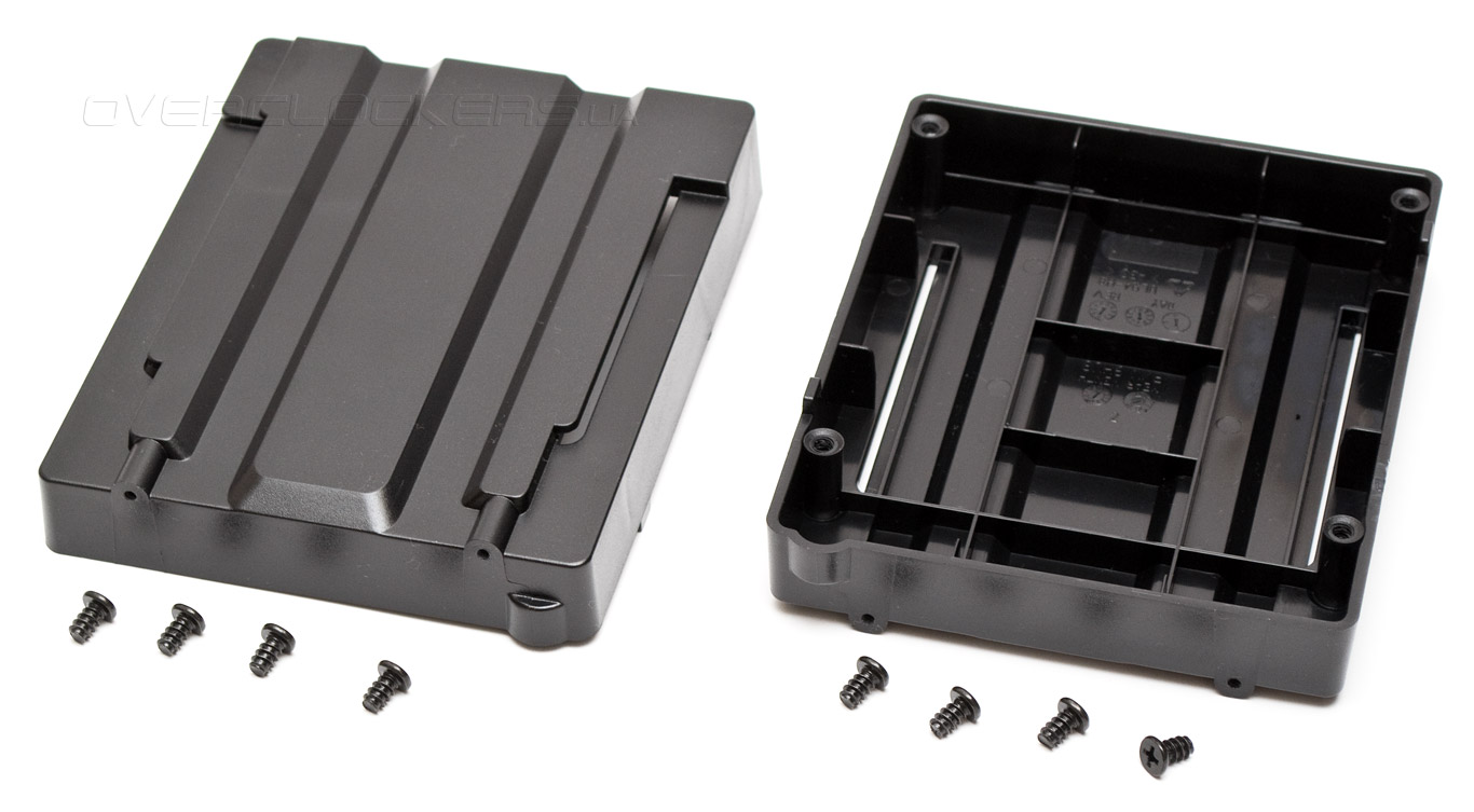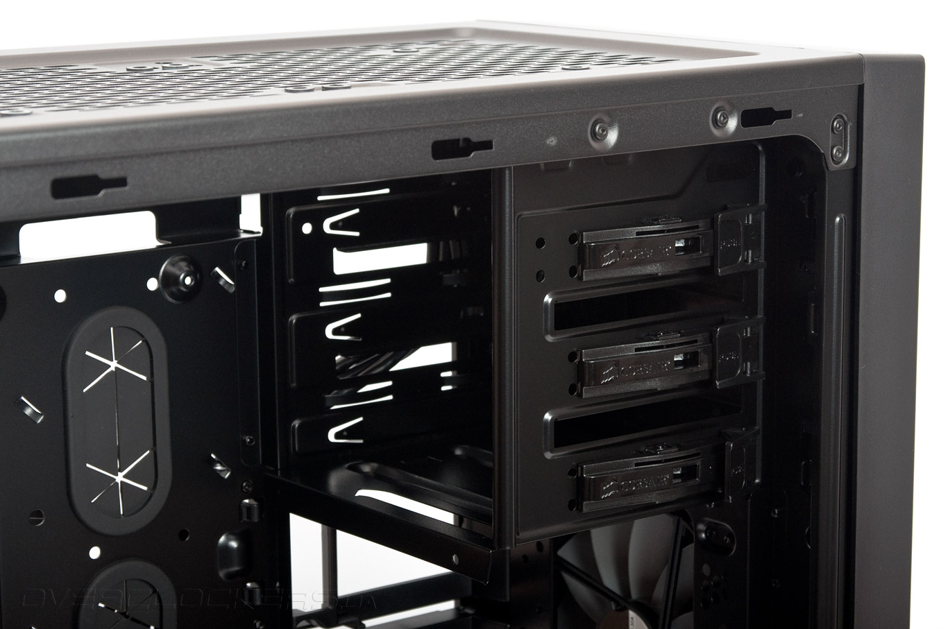 Три отсека для 5,25″ устройств оборудованы с левой стороны специальными фиксаторами для быстрого крепления. Защелка справа служит замком, а сами качели имеют штырьки с одной стороны, которые в закрытом положении не дают установленному приводу сдвинуться с места. Работает данная система только со стандартными устройствами, для остальных случаев есть обычные винты в сочетании с отверткой.