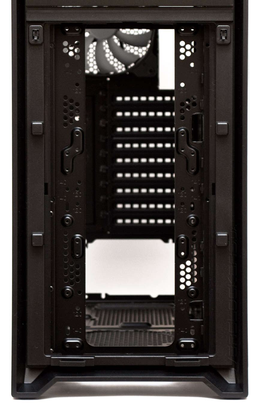 На задней панели предустановлен на выдув 140-мм вентилятор с серой крыльчаткой. Девять слотов расширения закрыты вентилируемыми многоразовыми заглушками, которые удерживаются винтами с накатанной головкой.