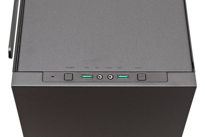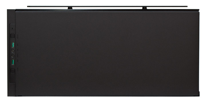 Внешние порты находятся на верхней грани фронтальной панели. Если смотреть слева направо, то тут есть индикатор питания системы, кнопка запуска, два порта USB 3.0, между которыми расположены два 3,5-мм аудио-разъема для микрофона и наушников. Крайняя справа кнопка сброса выглядит точно так же, как и клавиша старта, и их можно легко спутать между собой, особенно, если не смотреть на поясняющие надписи сверху.