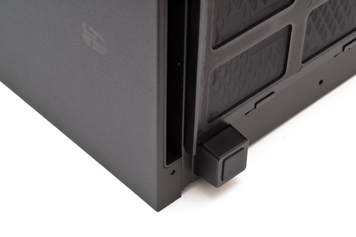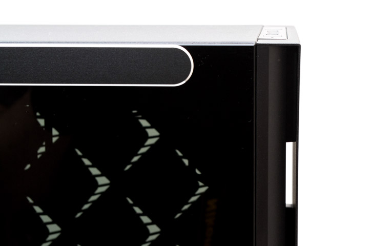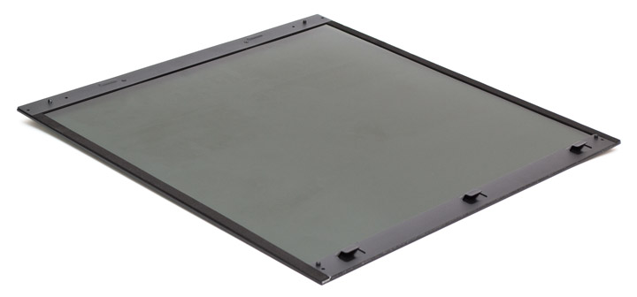Левая боковая панель полностью сделана из сильно тонированного закаленного стекла толщиной в 4 мм. Самая интересная особенность этого окна состоит в способе крепления и открывания. Держится оно на магнитах в районе верхней грани и зацепах снизу. Чтобы снять панель, достаточно отклонить ее на бок и потянуть вверх. Никаких винтов, кнопок, защелок. Подобное решение мне еще не встречалось. С одной стороны, это очень удобно, но нужно быть осторожнее при переноске корпуса, чтобы дверь не открылась случайно.