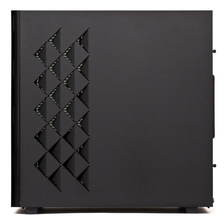 Левая боковая панель ровная, но в ее передней части есть набор из утопленных внутрь вентиляционных отверстий треугольной формы с пластиковыми решетками. Держится дверь на двух винтах с накатанной головкой и имеет ручку для облегчения демонтажа. Снимается она, к слову, по направлению назад и в сторону с большими усилиями. Подгонка данной детали оказалась слишком плотной.