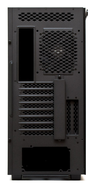 Задняя панель позволяет визуально оценить, насколько просторен этот корпус на самом деле. Решетка сверху намекает на то, что над материнской платой есть много места. На сетку возле задних портов материнской платы можно повесить один 120- или 140-мм вентилятор. Слотов расширения PCI есть восемь штук по горизонтали и еще два вертикальных сбоку. Все они закрыты вентилируемыми многоразовыми заглушками. Декоративная пластина, прикрывающая слоты, держится на винте с накатанной головкой. Отверстия под блок питания позволяют поворачивать его в обе стороны, но лучше направить БП вентилятором вниз.