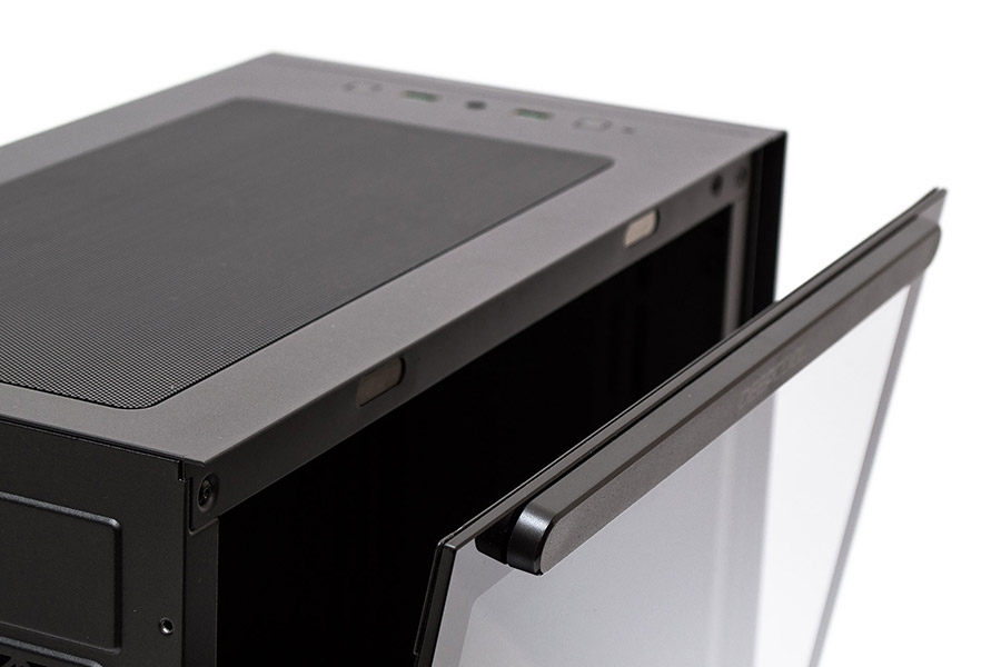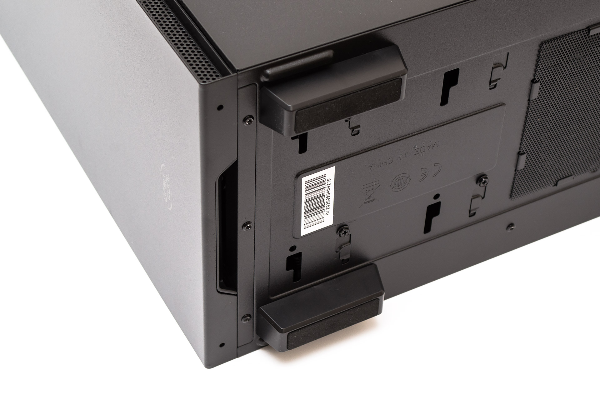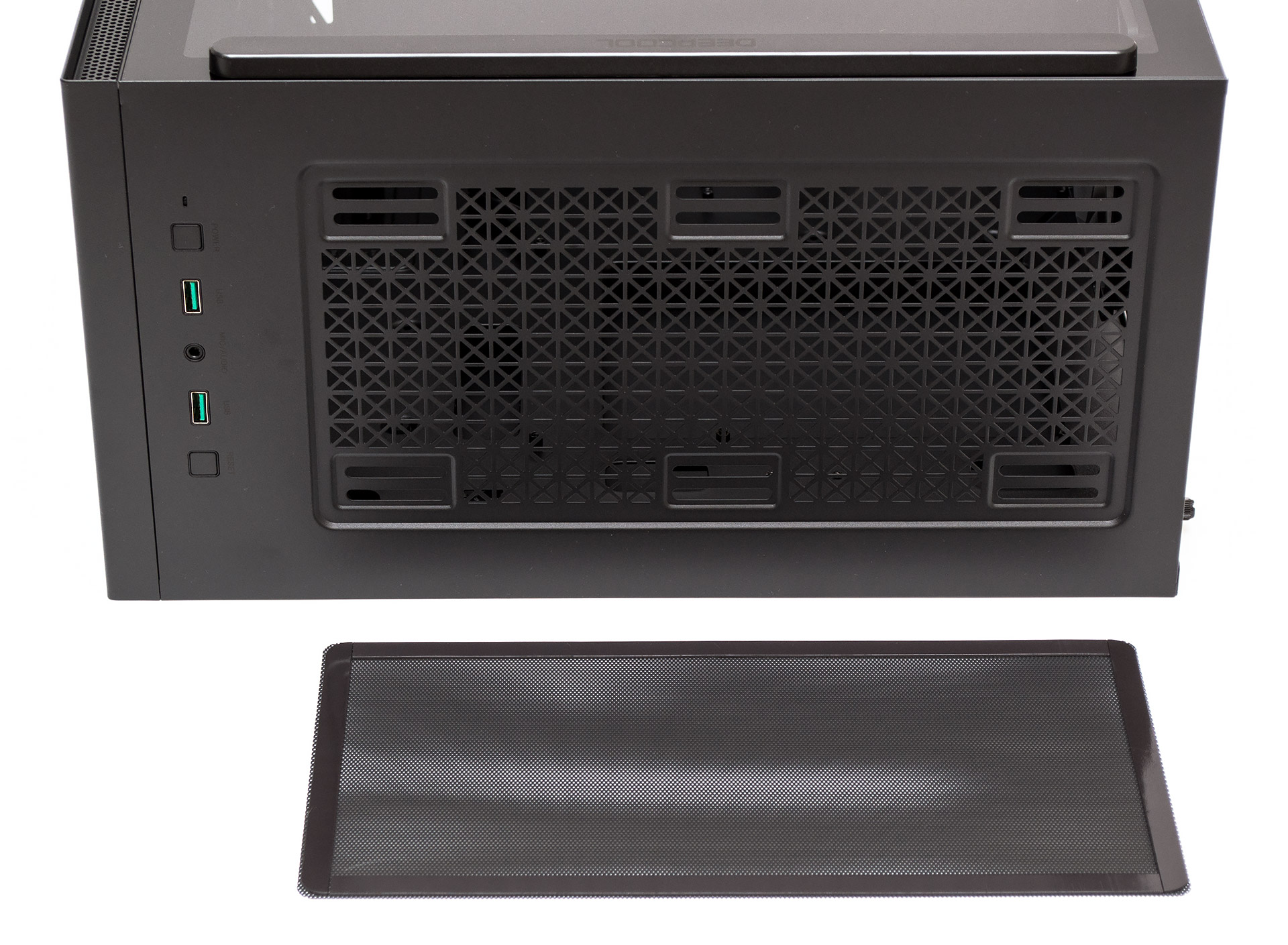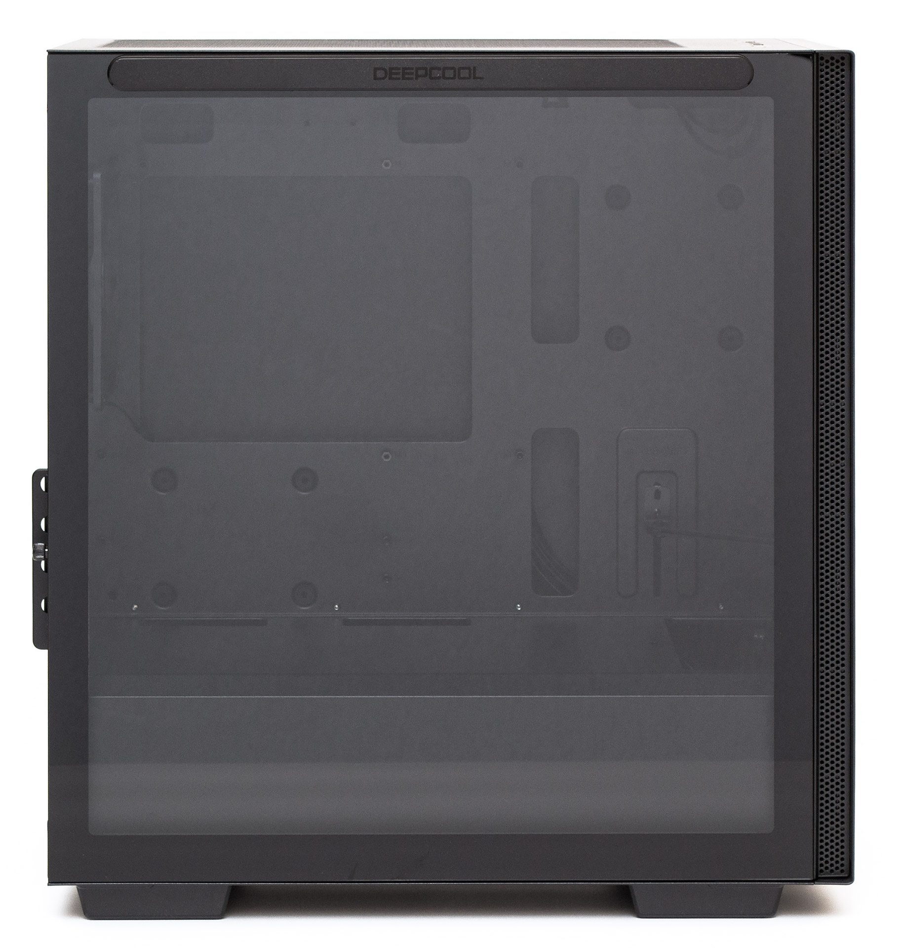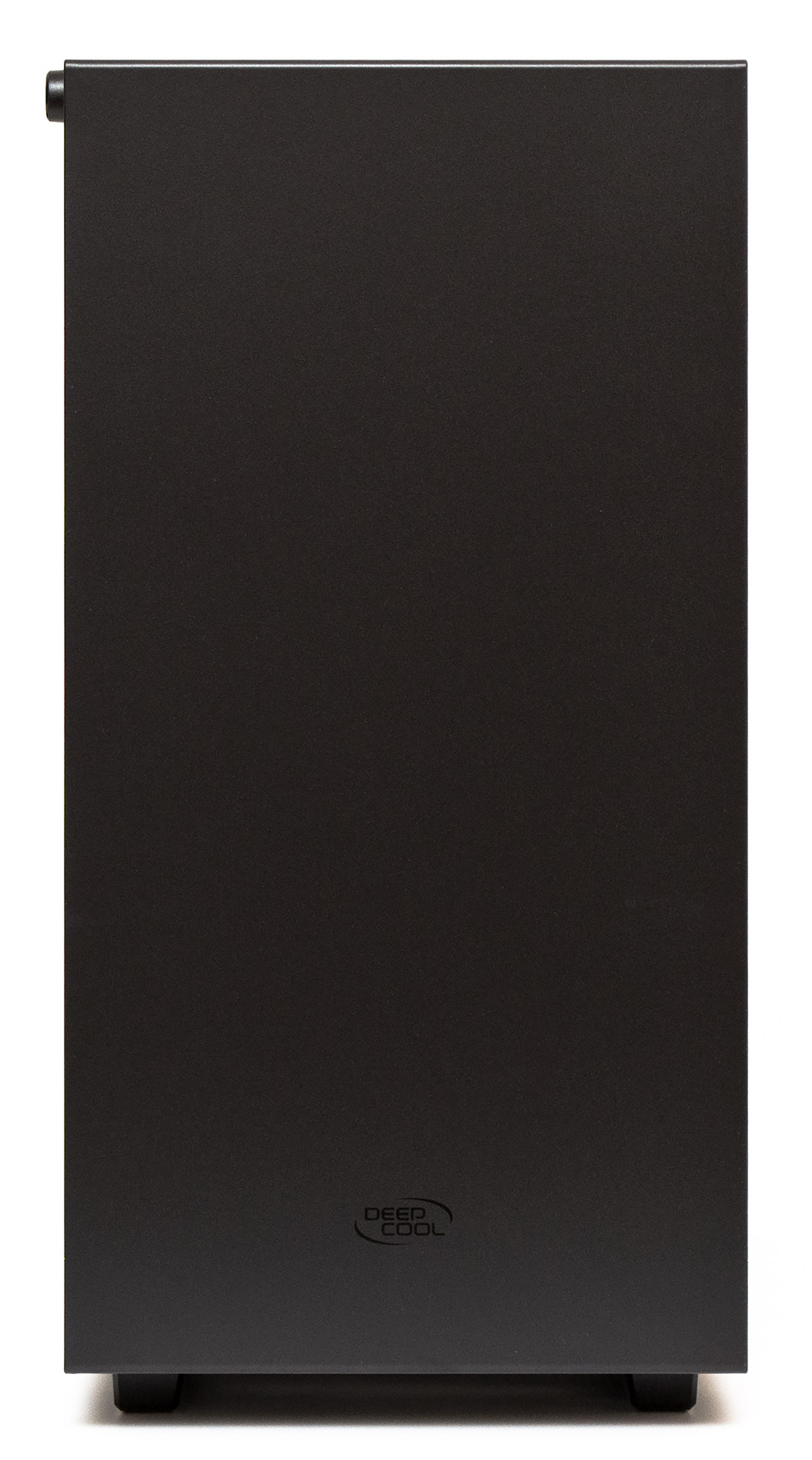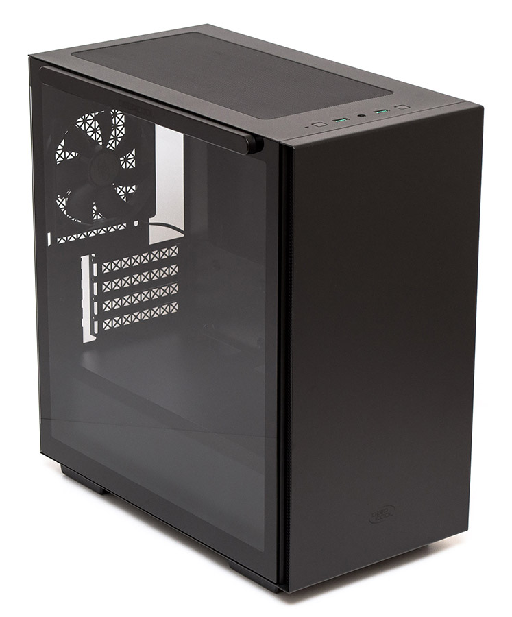 Концептуальная простота дизайна начинается с совершенно ровной и прямой передней металлической панели, на которой нет ничего, кроме едва заметного логотип Deepcool, нанесенного по центру внизу. Вентиляционные отверстия скрыты в гранях по бокам фронта и прикрыты металлической сеточкой.