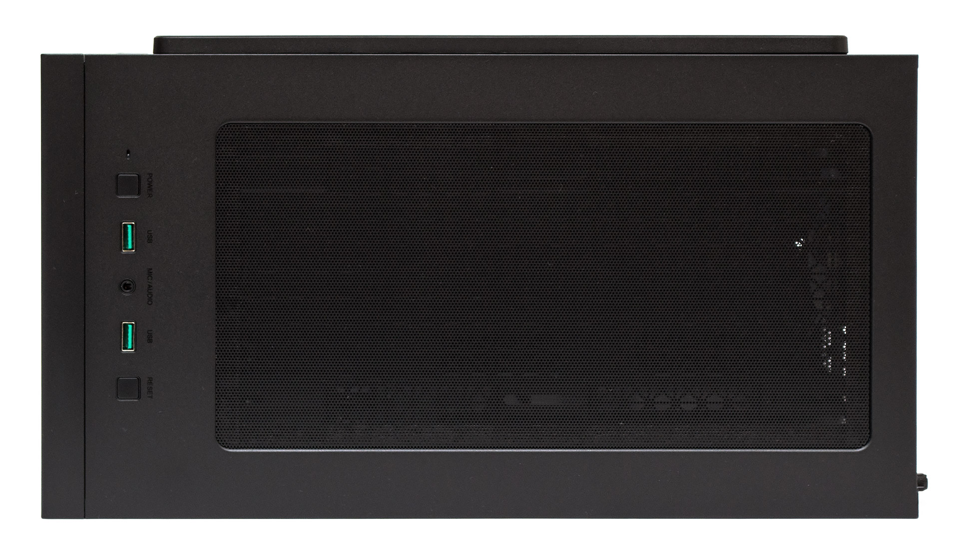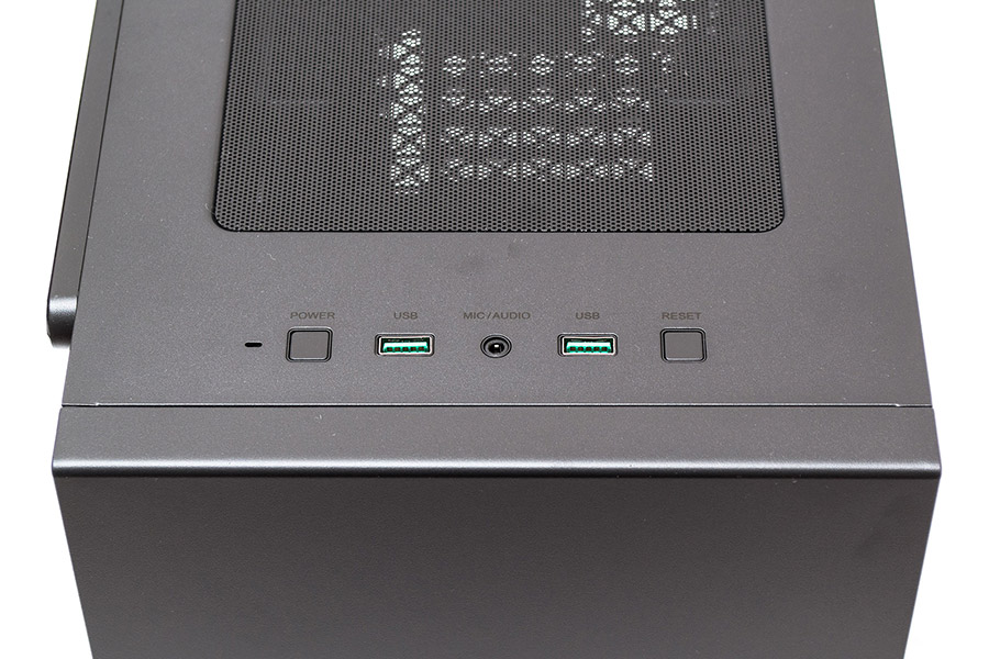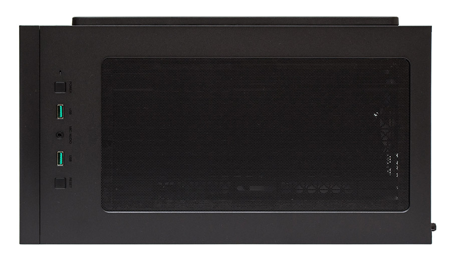 Кнопки управления и внешние порты собраны в ряд, в передней части верхней панели. Слева направо по порядку расположены: белый индикатор активности накопителей, маленькая квадратная кнопка старта ПК, порт USB 3.0 (зеленого цвета), совмещенный 3,5-мм аудио-разъем для гарнитуры, еще один USB 3.0, и мелкая квадратная клавиша перезапуска системы.