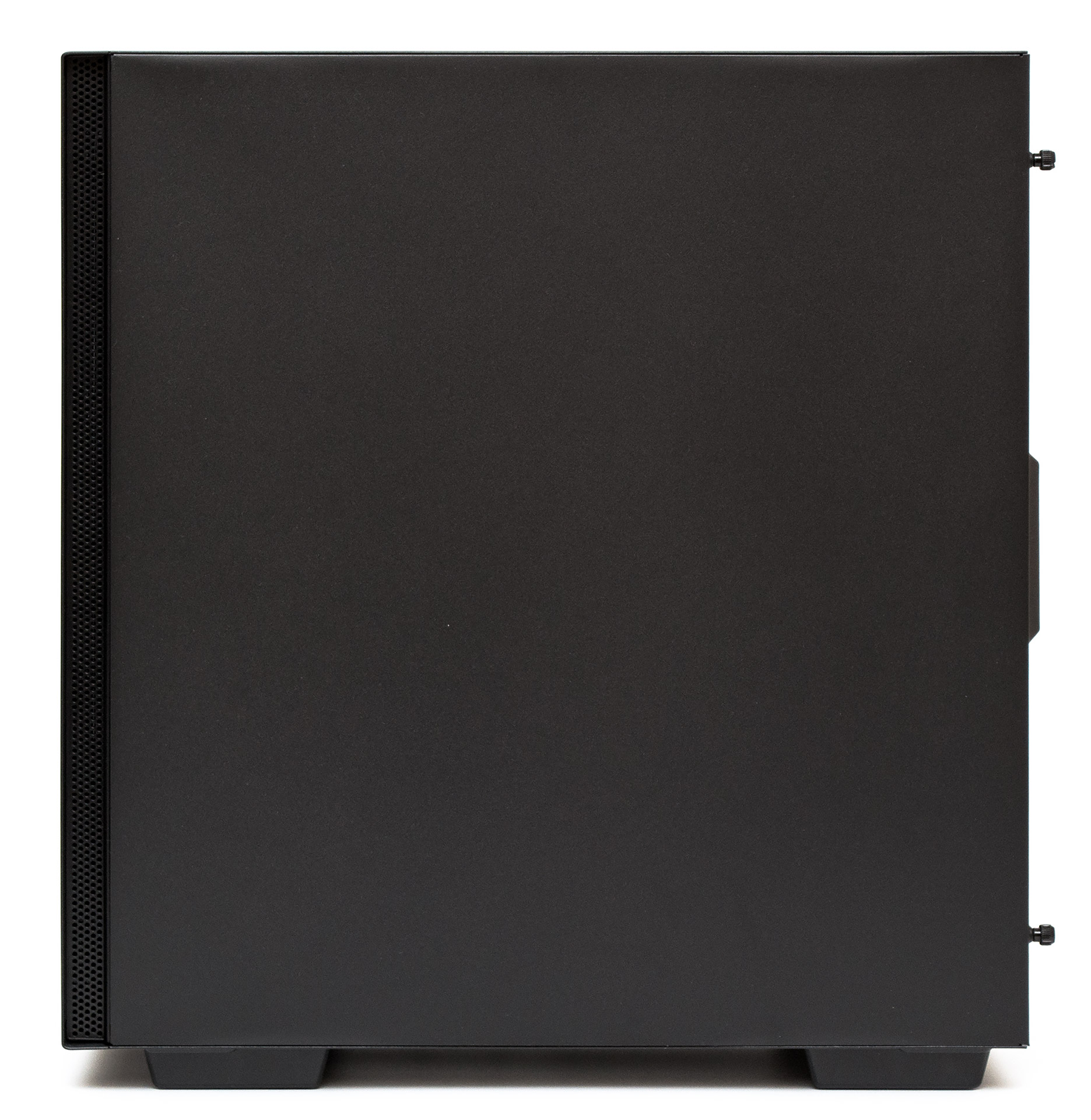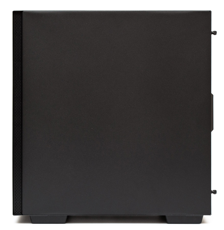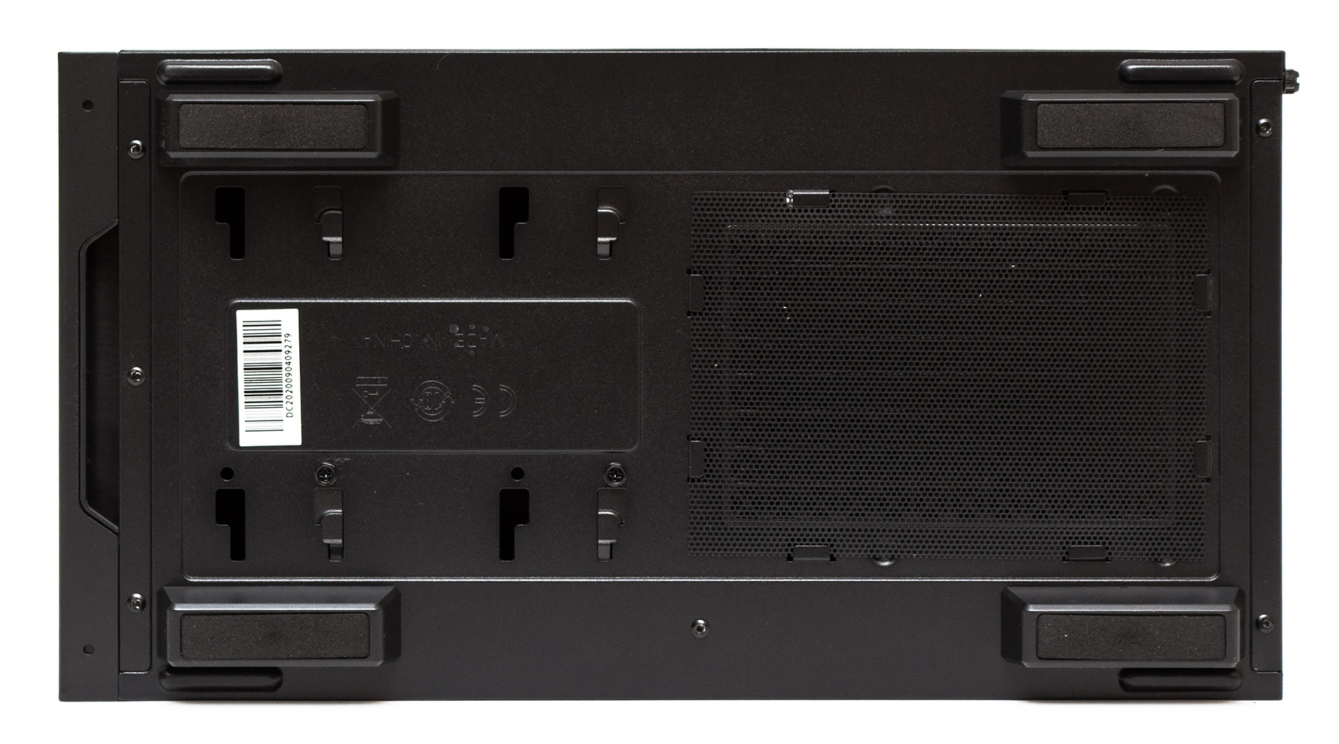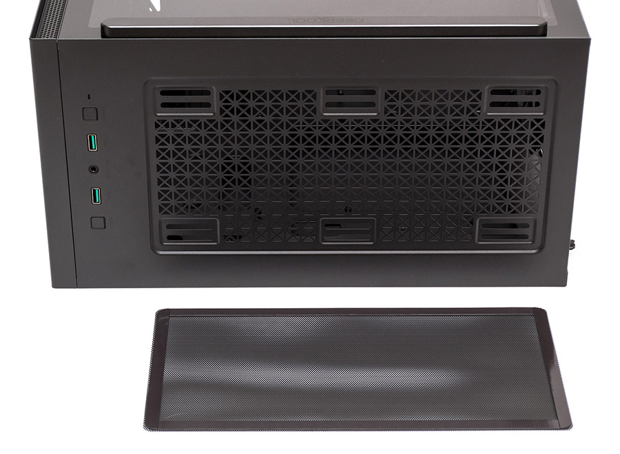 На основании корпуса есть четыре удлиненные пластиковые ножки. Вентиляционное отверстие блока питания прикрыто металлической сеточкой пылевого фильтра, держащейся в пазах. В передней части основания можно найти два винта, удерживающих корзину для накопителей. Выемка в передней панели позволяет упростить процесс её демонтажа.