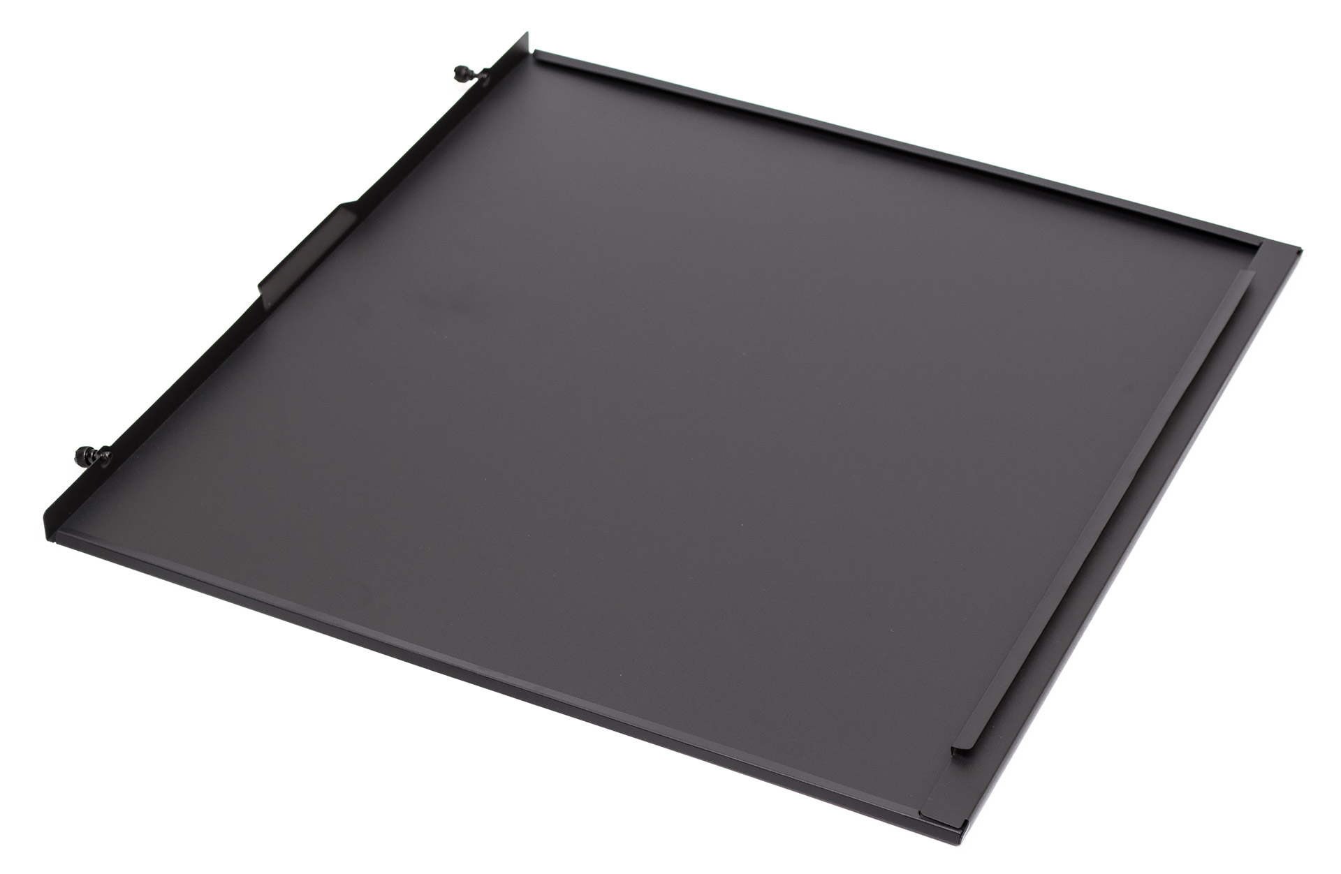 Правая дверца ровная и сплошная, сделана из металла. Держится на двух винтах с накатанной головкой, которые закреплены в панели (что сильно уменьшает шансы на их потерю). Для облегчения процесса демонтажа по центру сзади есть штампованная ручка. Открывание происходит в сторону наружу, что облегчает закрытие дверцы при плотной укладке кабелей.