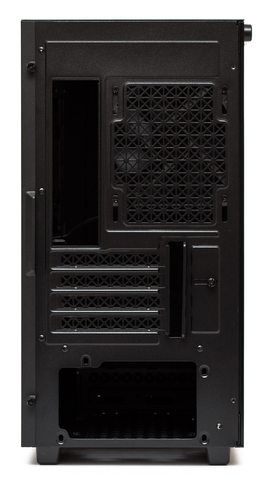 Задняя панель стандартна. Справа вверху есть вентиляционная решетка, за которой закреплен предустановленный 120-мм вентилятор. Его положение можно изменить в пределах пары сантиметров по высоте. Четыре слота расширения PCI закрыты одноразовыми вентилируемыми заглушками. Напротив них на одном винте с накатанной головкой держится сдвижная декоративная шторка, прикрывающая собой технологическое отверстие. Блок питания можно установить только вентилятором по направлению вниз.