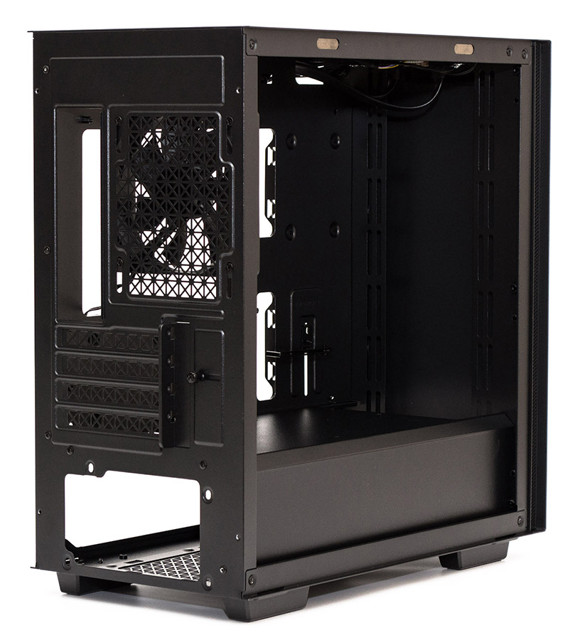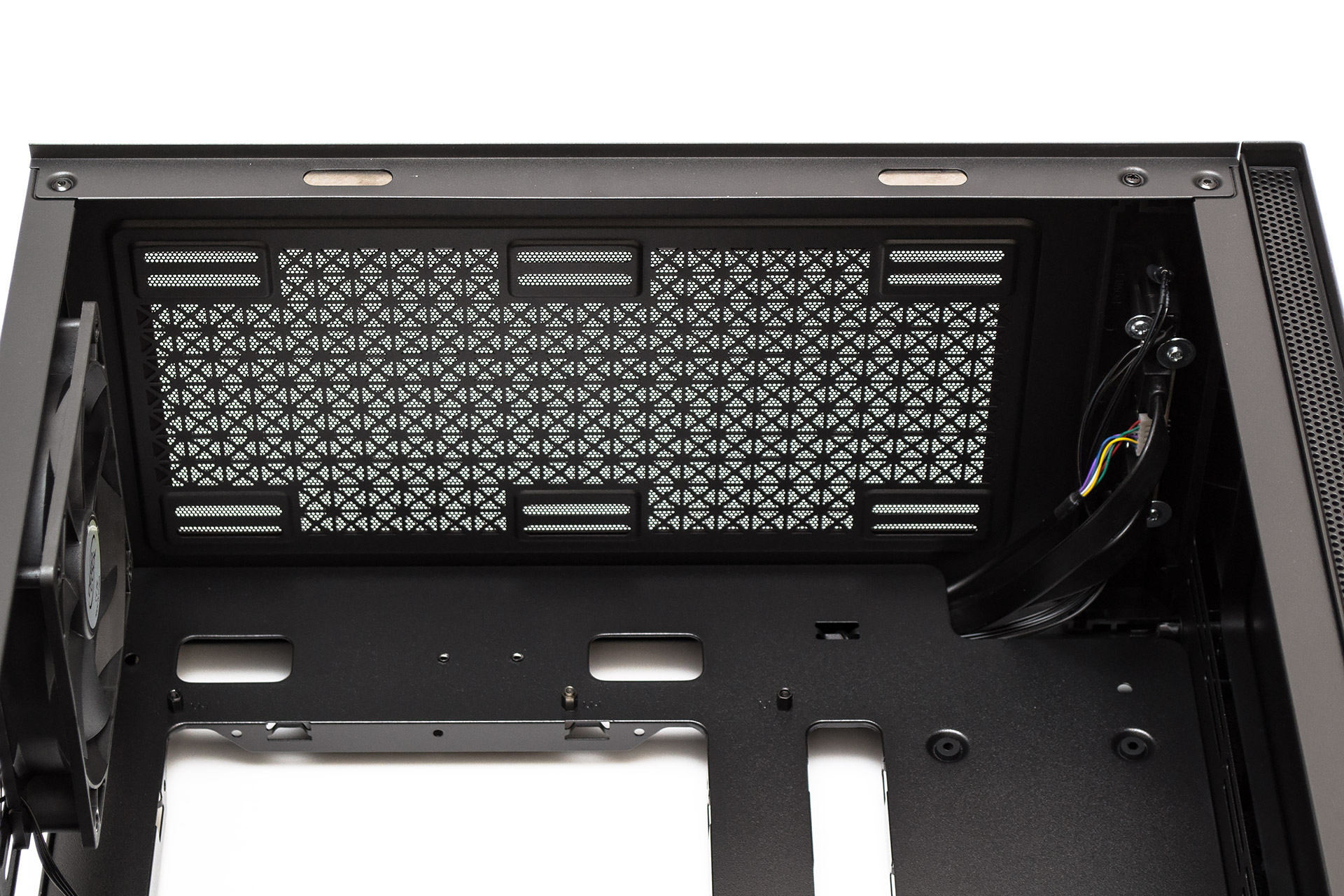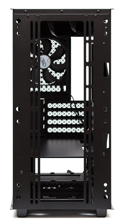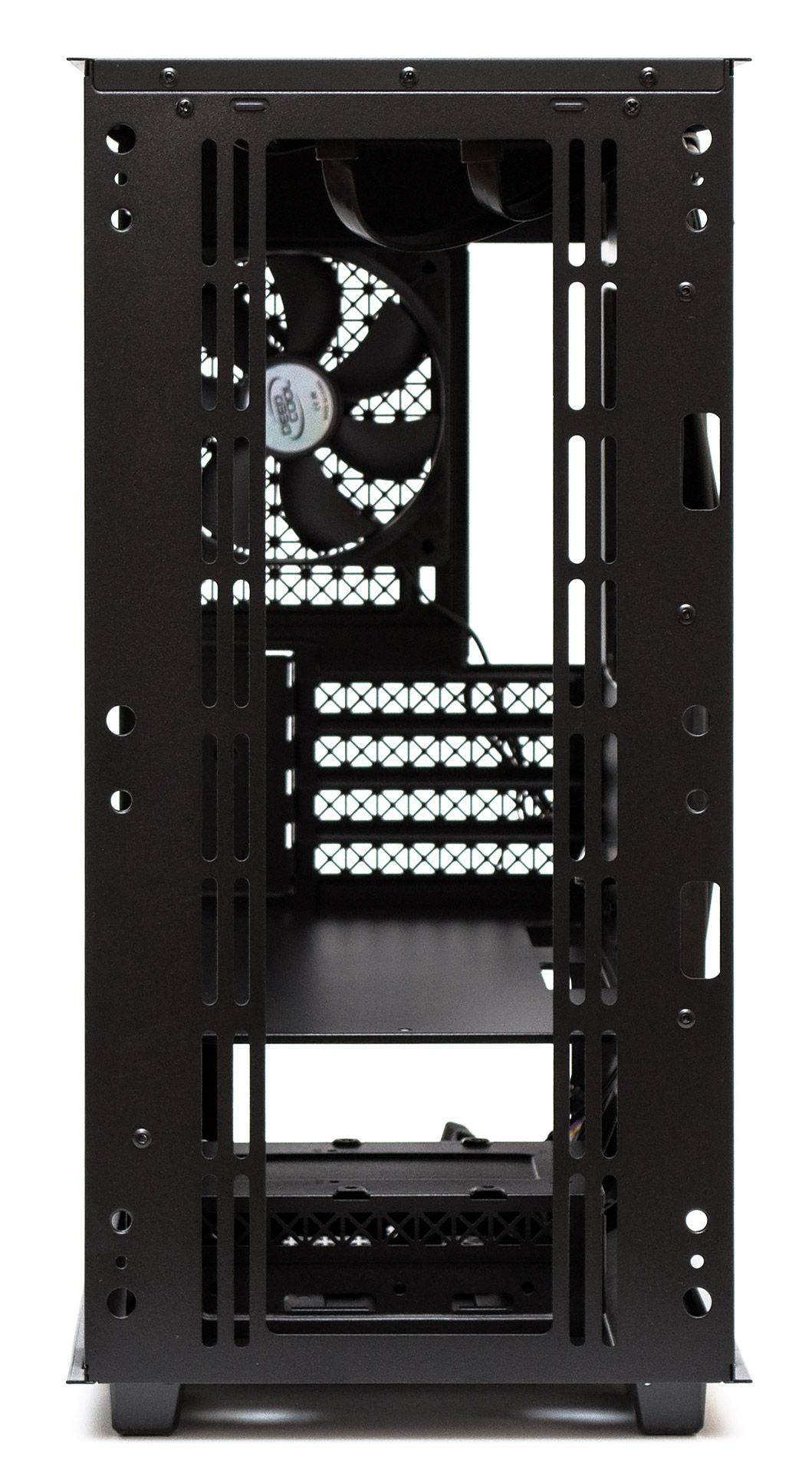В передней панели нет помех для движения воздуха (не считая полностью глухого фронта). По бокам есть продолговатые отверстия, на которые можно закрепить изнутри два 140- или три 120-мм вентилятора.