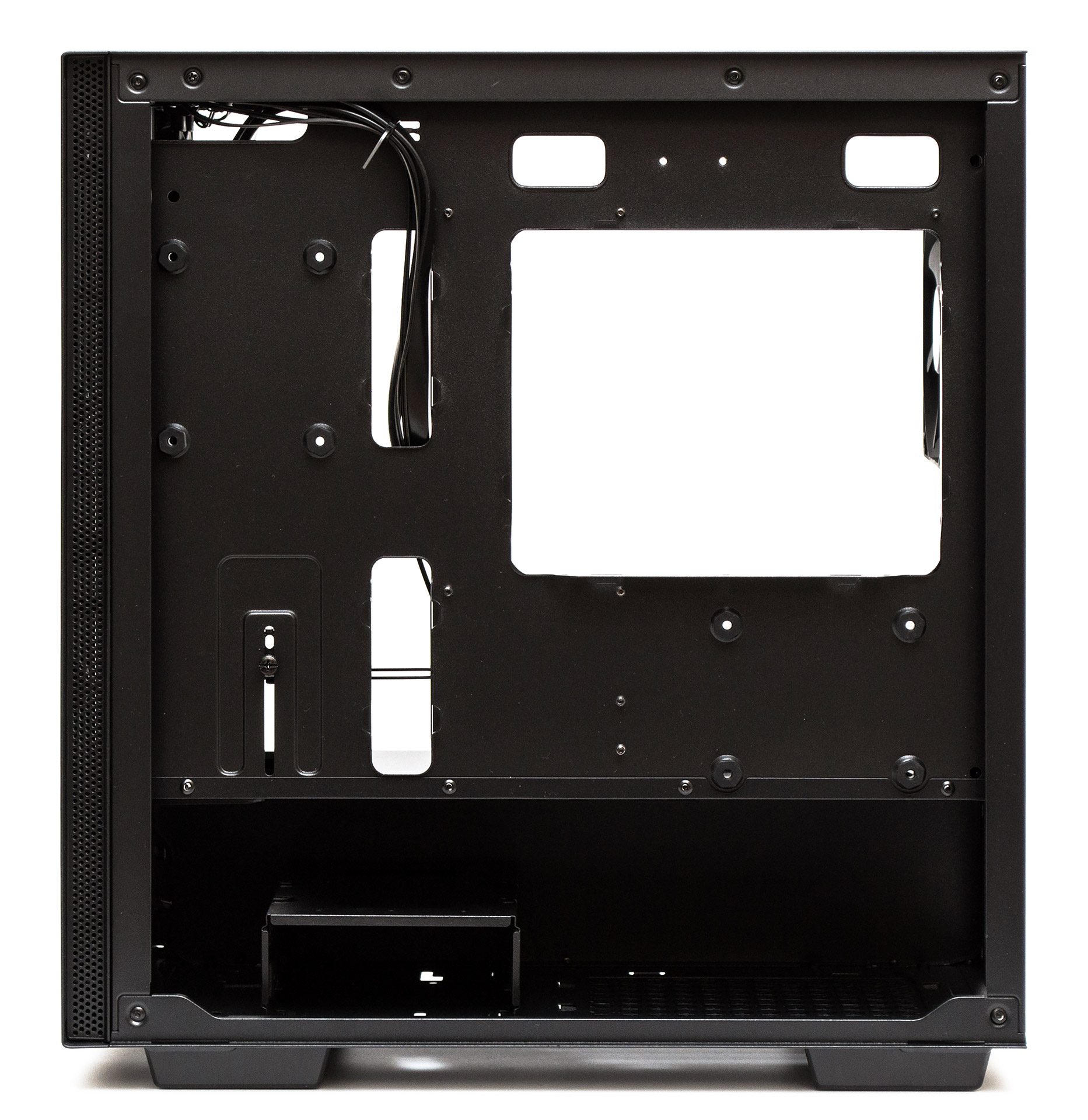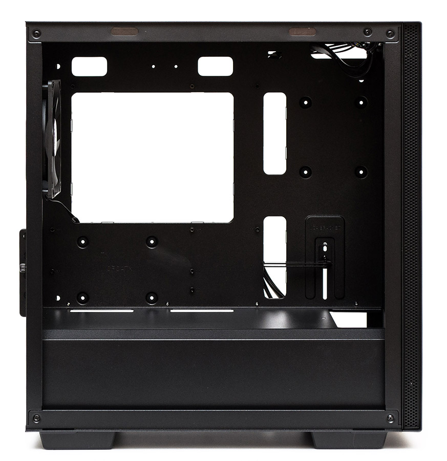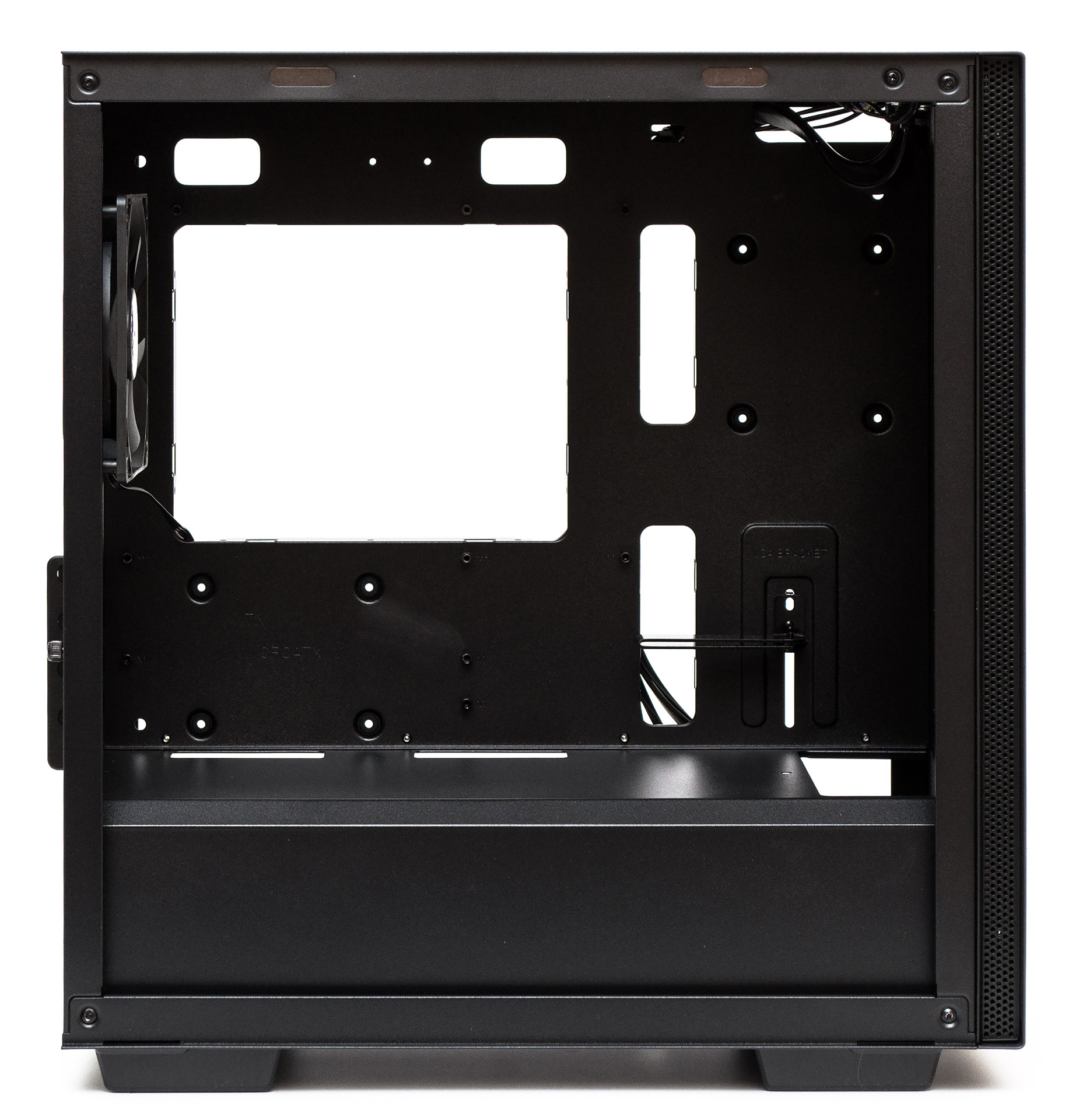 В передней панели нет помех для движения воздуха (не считая полностью глухого фронта). По бокам есть продолговатые отверстия, на которые можно закрепить изнутри два 140- или три 120-мм вентилятора.
