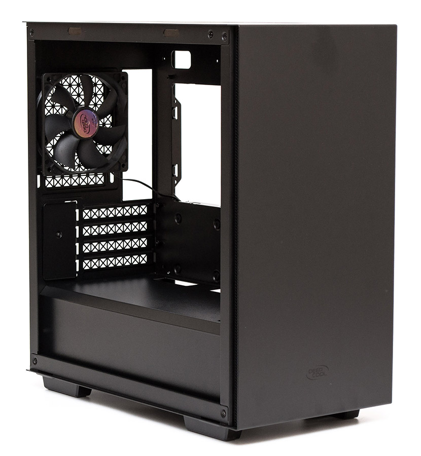 Концептуальная простота дизайна начинается с совершенно ровной и прямой передней металлической панели, на которой нет ничего, кроме едва заметного логотип Deepcool, нанесенного по центру внизу. Вентиляционные отверстия скрыты в гранях по бокам фронта и прикрыты металлической сеточкой.