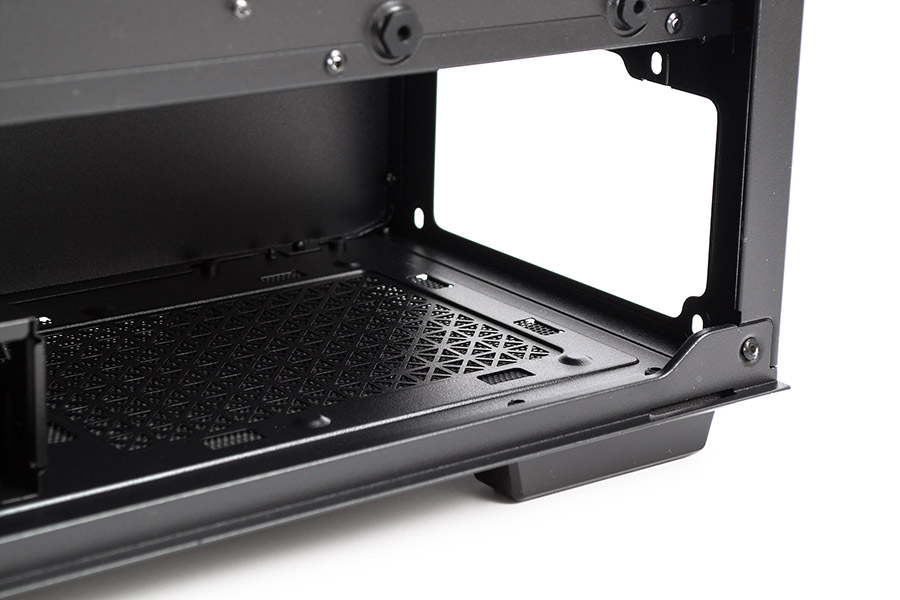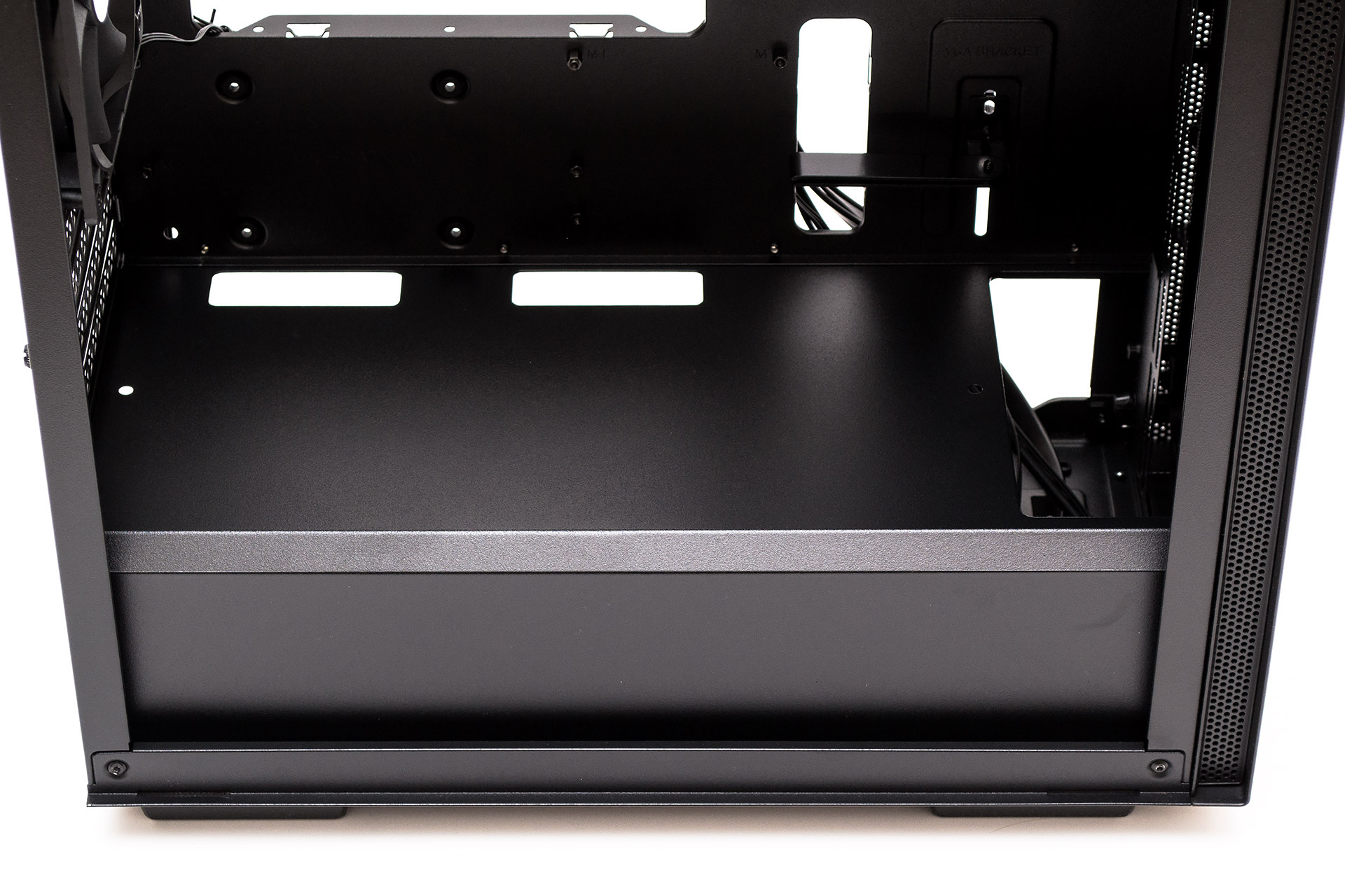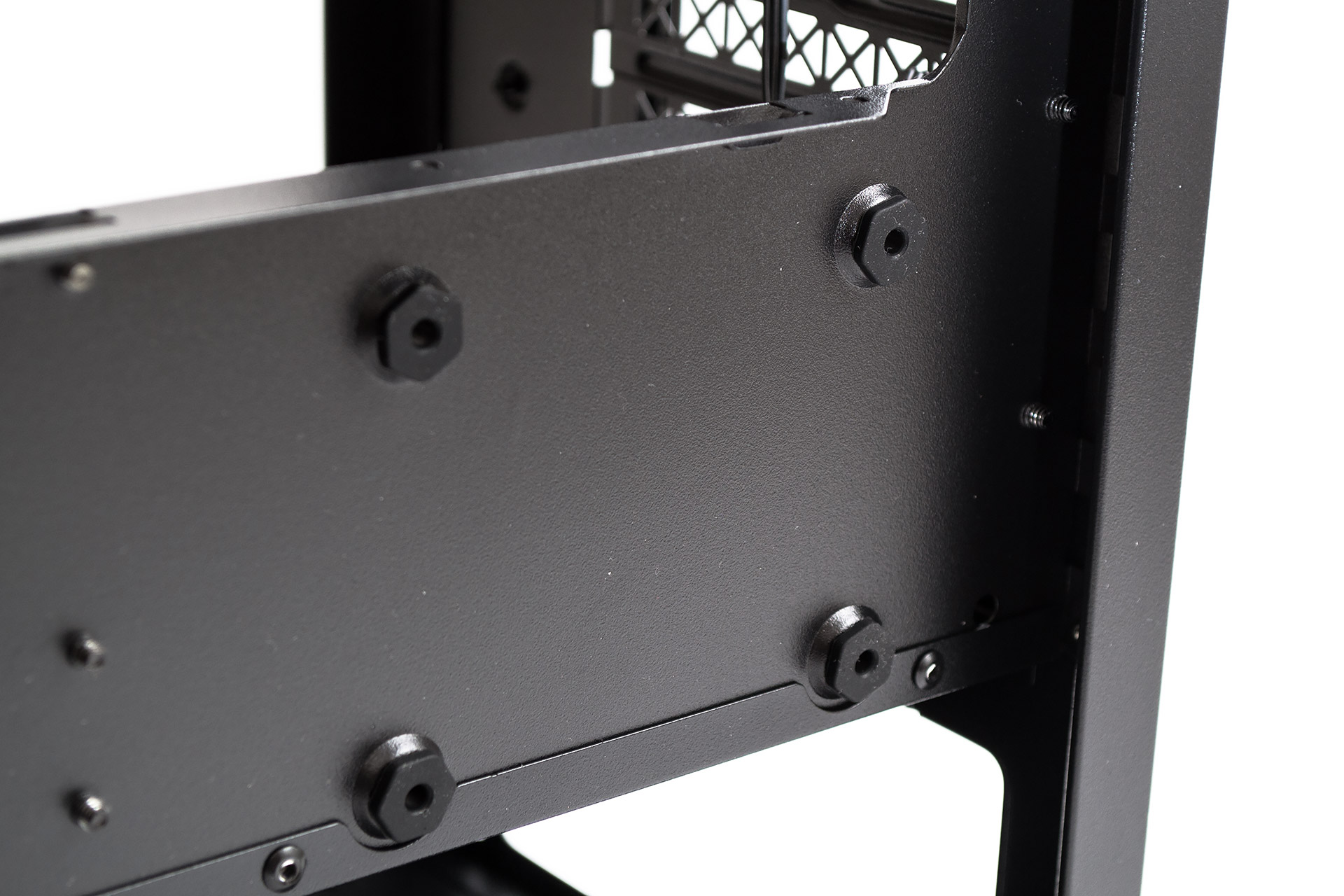 На основании корпуса есть четыре удлиненные пластиковые ножки. Вентиляционное отверстие блока питания прикрыто металлической сеточкой пылевого фильтра, держащейся в пазах. В передней части основания можно найти два винта, удерживающих корзину для накопителей. Выемка в передней панели позволяет упростить процесс её демонтажа.