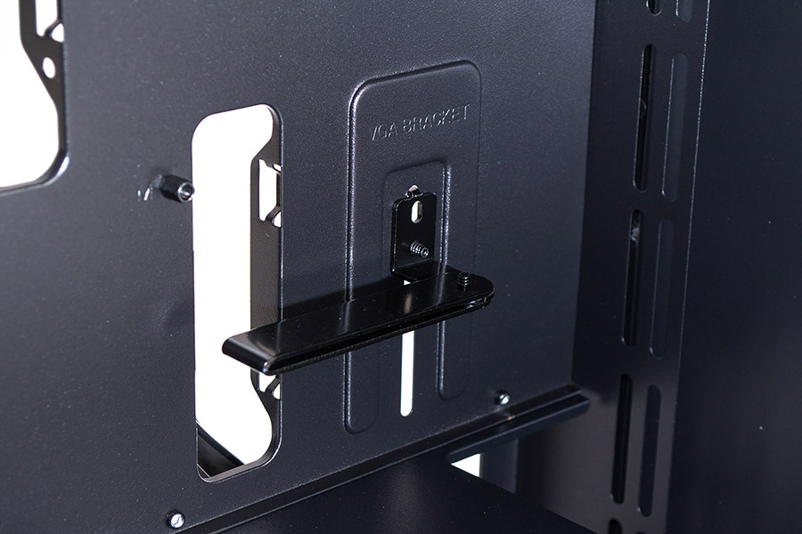 В нижней передней части поддона материнской платы есть регулируемый шарнир для поддержки длинных видеокарт. Его можно поворачивать в горизонтальной плоскости или смещать по высоте, фиксируя одним винтом с металлической накатанной головкой. Минимальная длина видеокарты, чтобы дотянуться до планки шарнира, должна быть более 245 мм.