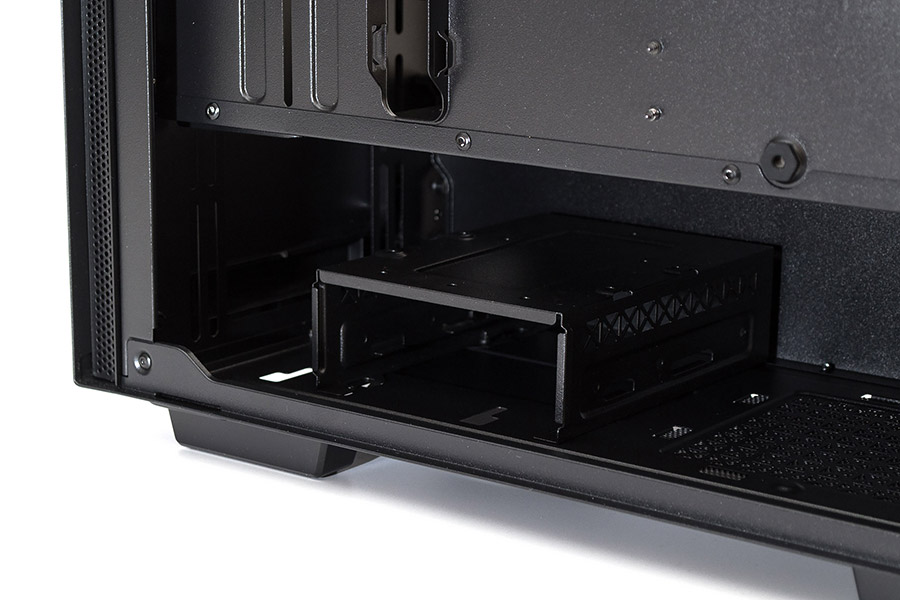 Корзина накопителей имеет П-образную форму и находится впереди снизу. Ее можно поставить в две позиции — ближе к передней панели (расстояние составит 28 мм) или дальше от неё (на 60 мм). Держится стойка на двух винтах и четырех зацепах снизу. Корзина может принять два 3,5″ жестких диска, или один 3,5″ накопитель в нижней секции и один 2,5″ диск в верхней.