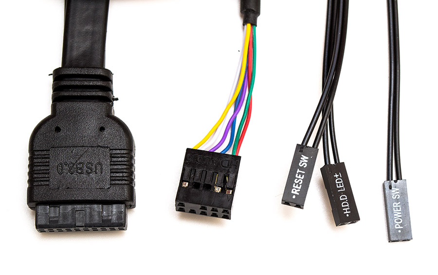 В набор кабелей от корпуса входит одна колодка USB 3.0, разъем HD Audio и три пары проводов от кнопок запуска и перезагрузки системы, а также индикатора активности накопителей. Все провода полностью окрашены в черный цвет и имеют достаточную для подключения длину.