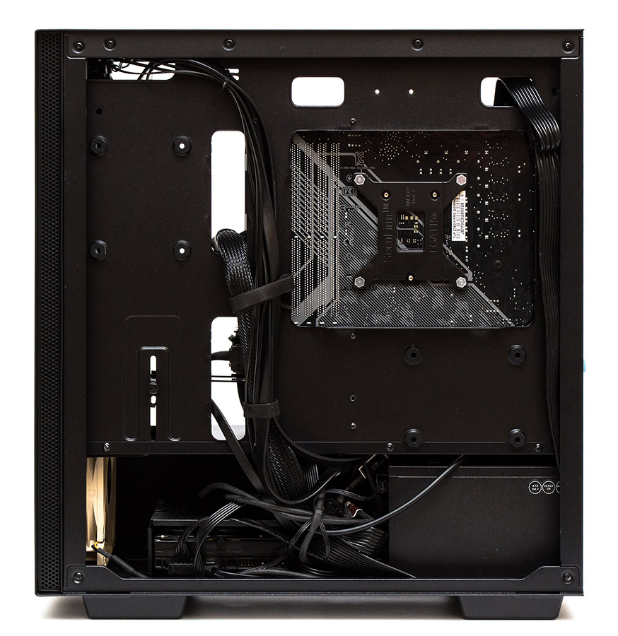 За поддоном материнской платы все организовано довольно просто и логично. От поддона до боковой панели есть 25 мм пространства для укладки проводов. Для усилительной пластины процессорного кулера есть крупный вырез вверху справа. Пять меньших по размеру отверстий предназначены для протяжки кабелей. Интересно, что проушины для кабельных стяжек расположены по периметру трех наиболее крупных прорезей, по две с каждой стороны, на загибах металла. По сути, это очень удобное и остроумное решение. Спереди вверху и внизу сзади есть по одному набору посадочных мест для 2,5″ накопителей.