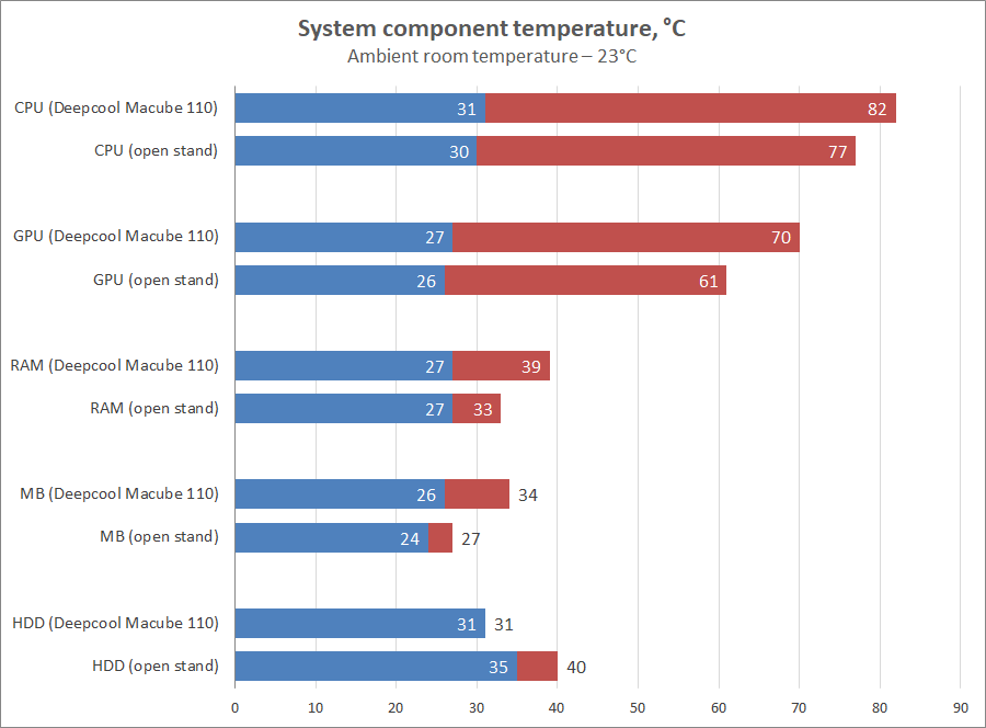 Почти с полным комплектом вентиляторов Deepcool Macube 110 показывает довольно средние результаты по части охлаждения. Причиной тому есть сплошная передняя панель и недостаточно большие вентиляционные отверстия по её сторонам. Процессор уступает открытому стенду пять градусов. Видеокарта — целых девять градусов, поскольку расположена слишком близко к «глухому» кожуху БП. Разница по температурам материнской платы и памяти тоже находится в районе 6–7 градусов. Зато жесткий диск вентилируется отлично, отыгрывая 9 градусов и не нагреваясь под нагрузкой. Впрочем, для любителей игровых систем это слабое утешение.