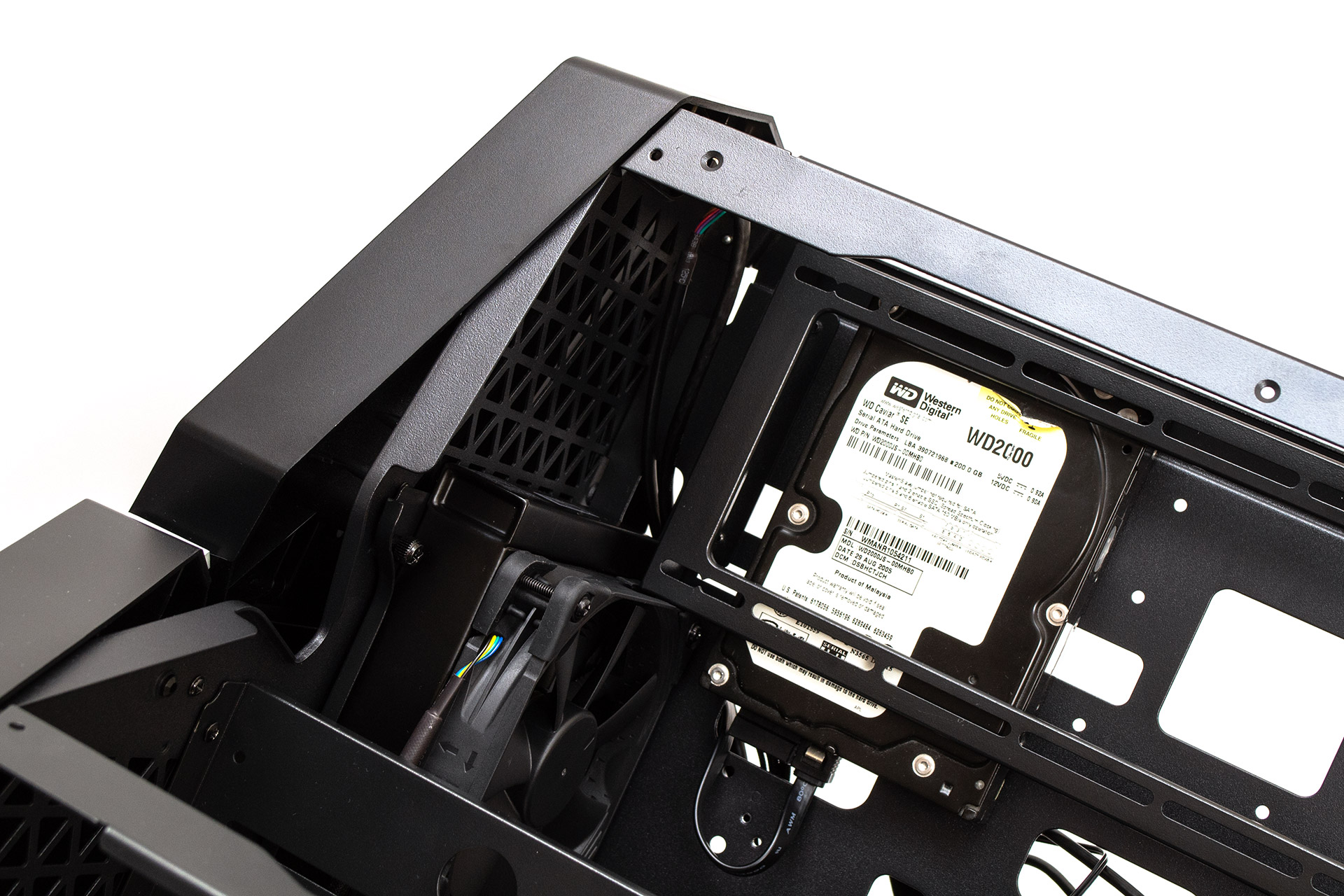 То же можно сказать и о жестких дисках. Диагональный наклон для них, и расположение вверху, куда направляется обычно горячий воздух, это худший возможный вариант. Советую в этом корпусе ограничиться SSD накопителями.