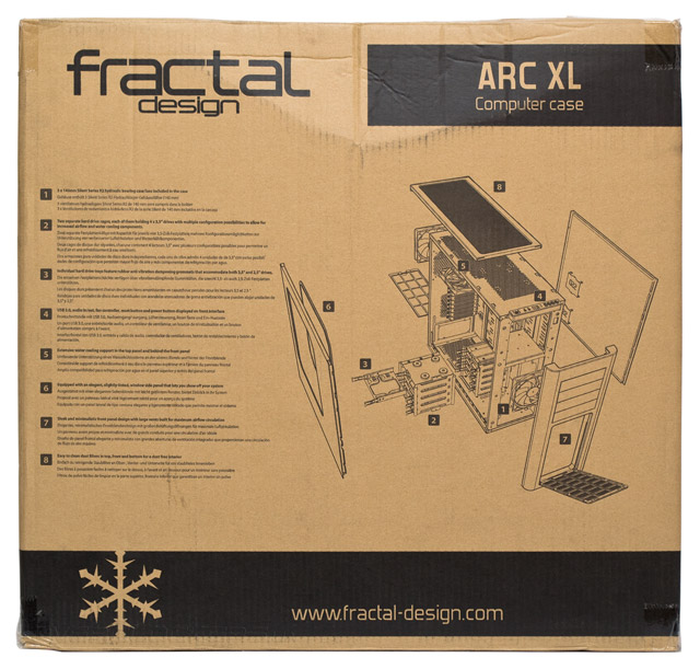 В упакованном виде корпус весит 16,3 кг. Полиграфия на всех сторонах упаковки монохромная, но информативная. На фронтальной части изображен корпус, повернутый в три четверти, а на тыльной стороне приведена схема разборки шасси, где в текстовом виде подписаны и описаны все основные компоненты.
