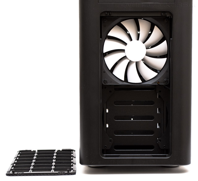 Нижняя панель, более чем на половину, закрыта длинным съемным пылевым фильтром, за которым находится решетка с крупной перфорацией. По центру днища предусмотрено посадочное место для одного 120- или 140-мм вентилятора, предназначенного для обдува видеоадапатеров.