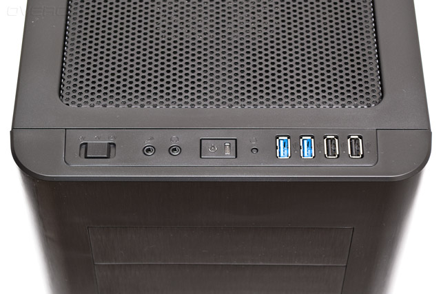 Органы управления вынесены на верхнюю грань передней панели. Маленький тумблер слева отвечает за изменение скорости вращения вентиляторов путем понижения их напряжения с 12 В до 7 или 5 В. За тумблером расположены два 3,5-мм аудиовхода, клавиша запуска ПК, очень маленькая кнопка перезагрузки, два порта USB 3.0 и два порта USB 2.0, которые нужно будет хоть иногда чистить от пыли.