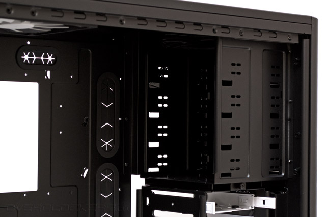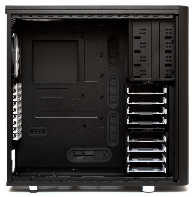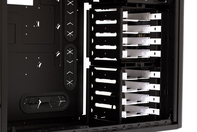 Arc XL поддерживает аналогичные с Define XL R2 возможности по конфигурации положения накопителей. Изначально мы имеем две съемные корзины, по четыре 2,5″ или 3,5″ накопителя в каждой.