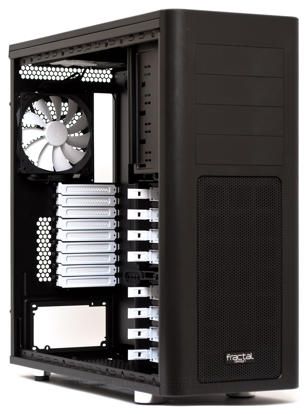 На задней панели предустановлен на выдув 140-мм вентилятор. Девять вентилируемых заглушек слотов расширения белого цвета удерживаются винтами с накатанной головкой.
