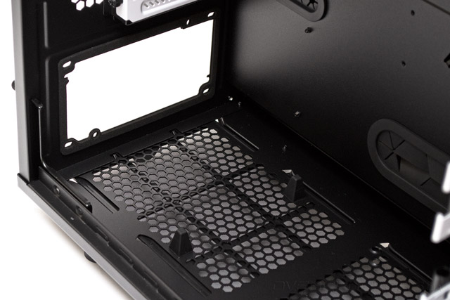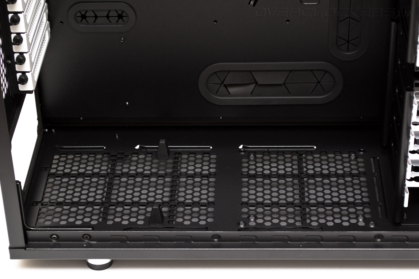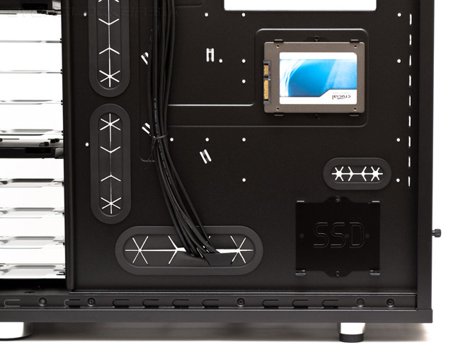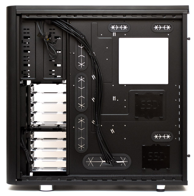 Поддон материнской платы имеет семь крупных прорезиненных отверстий и столько же проушин для скрытой укладки проводов. Отверстие для усилительной пластины достаточно большое, расположено удачно и подойдет по габаритам под все современные процессорные разъемы. Расстояние от поддона до правой боковой дверцы составляет 26 мм, чего вполне хватает для нормальной укладки всех кабелей.