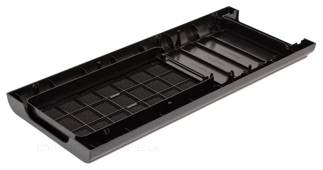 Фронтальная пластиковая панель удерживается на шести креплениях типа "тюльпан" и снимается очень легко. Никаких проводов к ней не присоединено. При снятии мы заметили, что фильтр вентиляторов не очень плотно фиксируется в своих пазах и может слегка дребезжать.