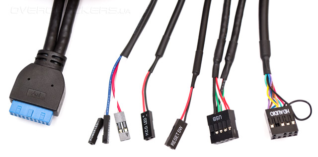 Набор кабелей передней панели включает в себя: колодку внутреннего подключения USB 3.0, четыре провода от клавиш перезагрузки и запуска ПК, индикатора питания и светодиода активности накопителей, колодку USB 2.0 и кабель HD Audio. Длина всех шнуров более чем достаточная.
